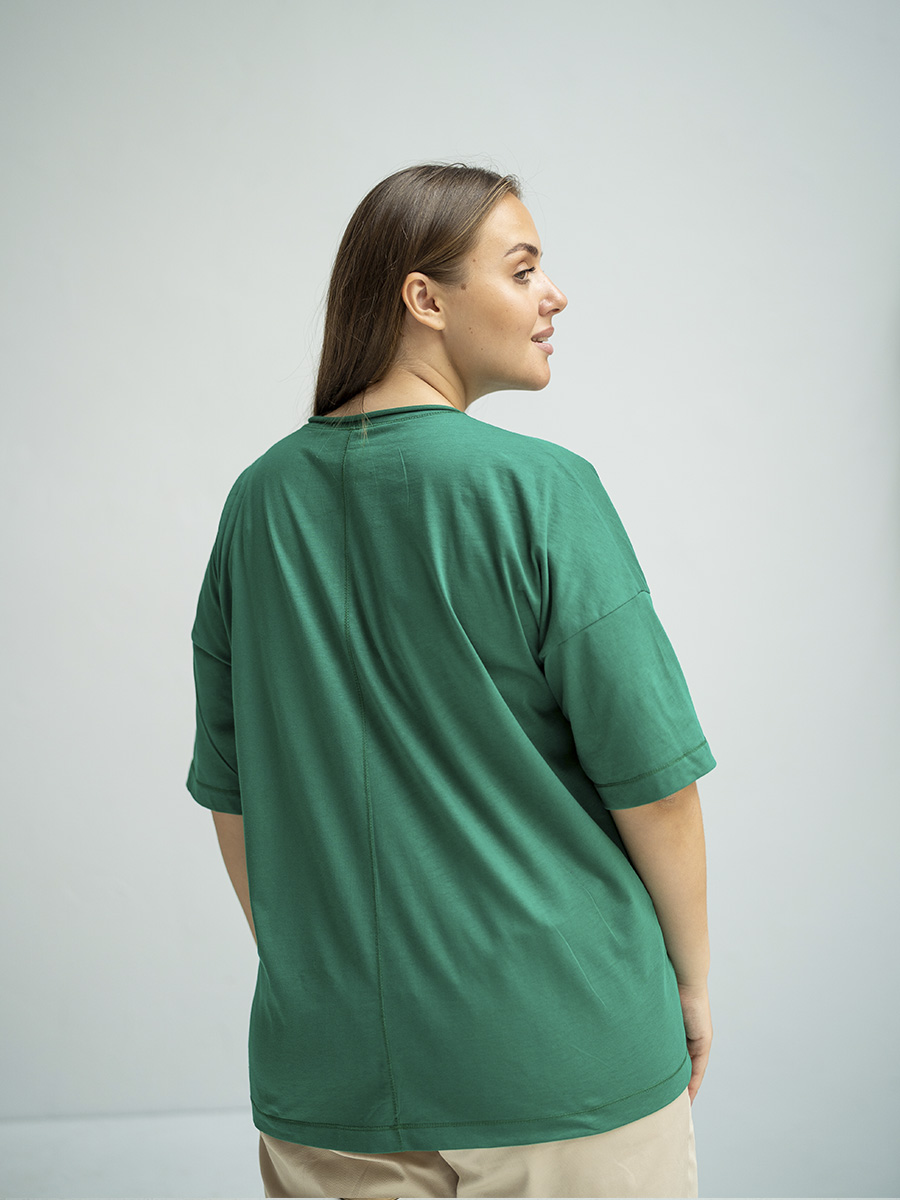 Описание: Женская зеленая футболка свободного кроя большого размера от бренда Модресс (modress)