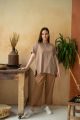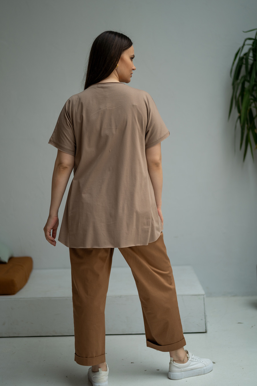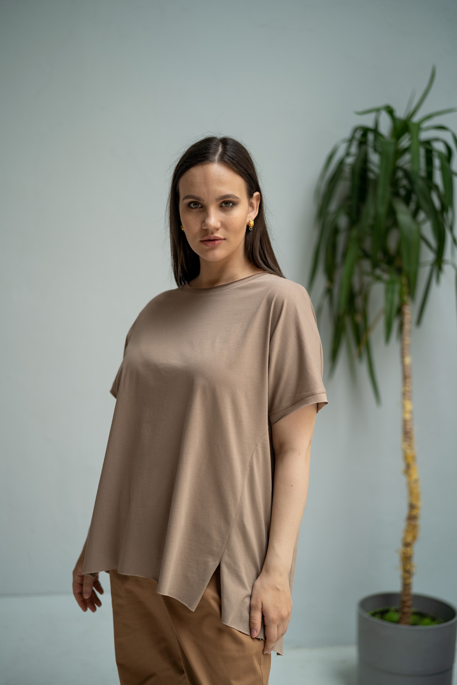 Футболка из 100% хлопкового трикотажа. Имеет фасонные рельефы, необработанные края и ассиметричный ни