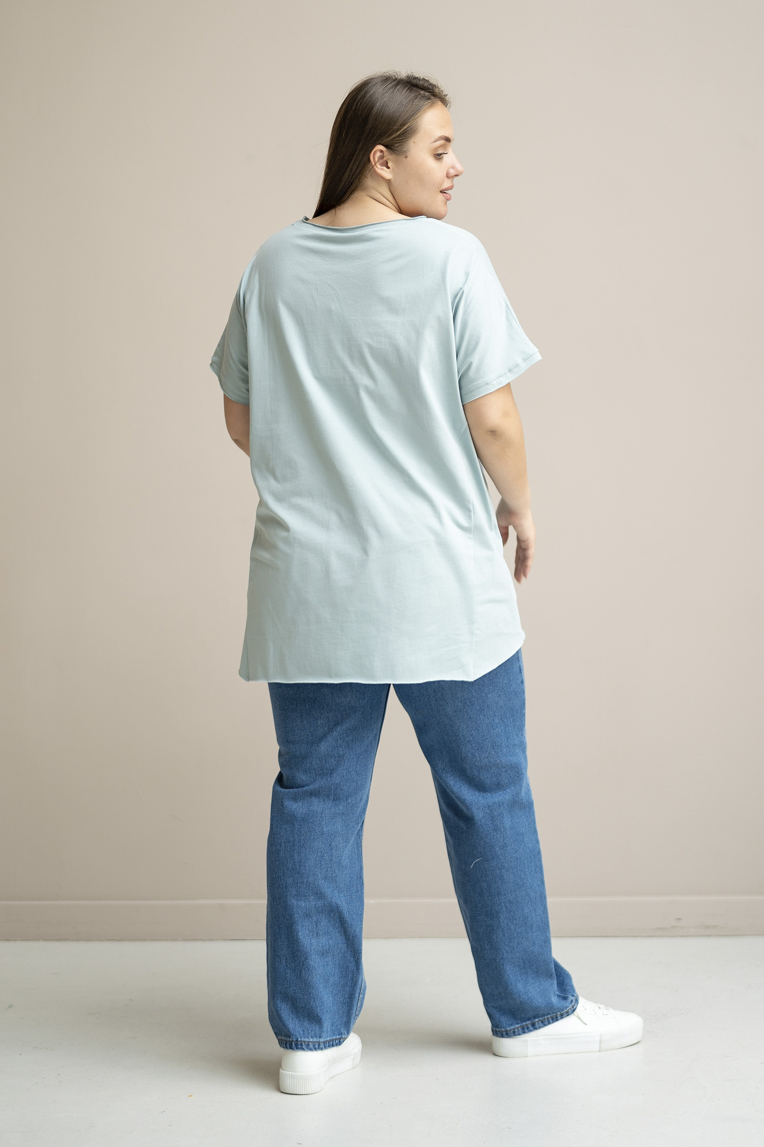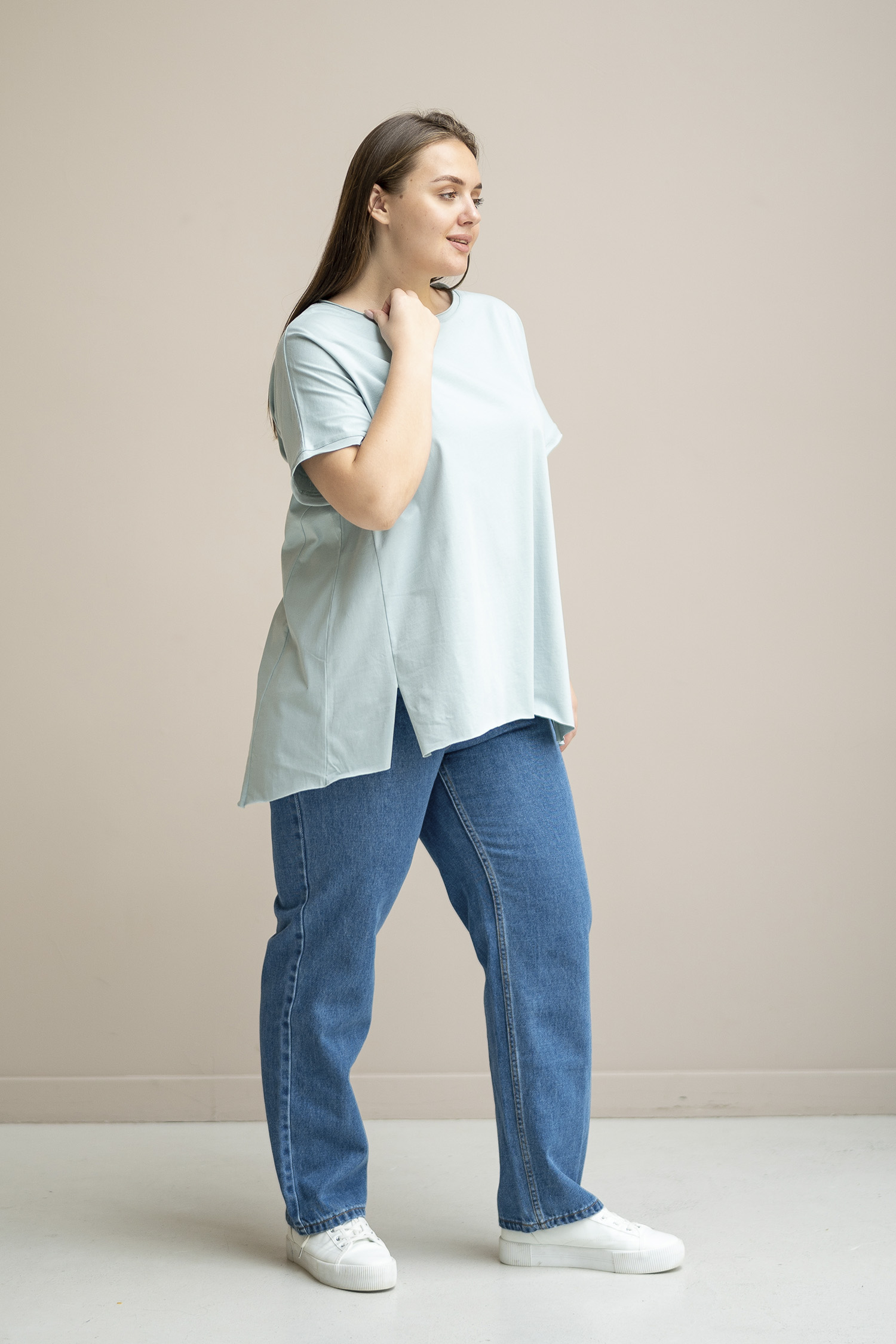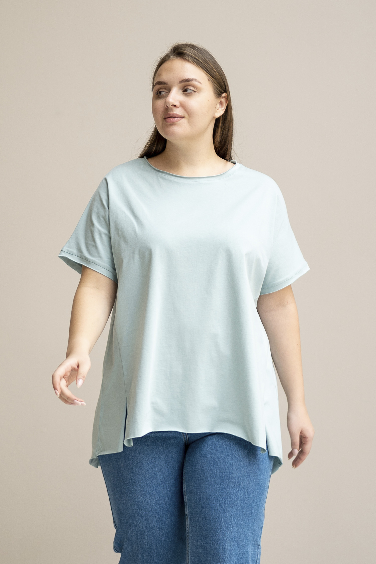 Футболка из 100% хлопкового трикотажа. Имеет фасонные рельефы, необработанные края и ассиметричный ни