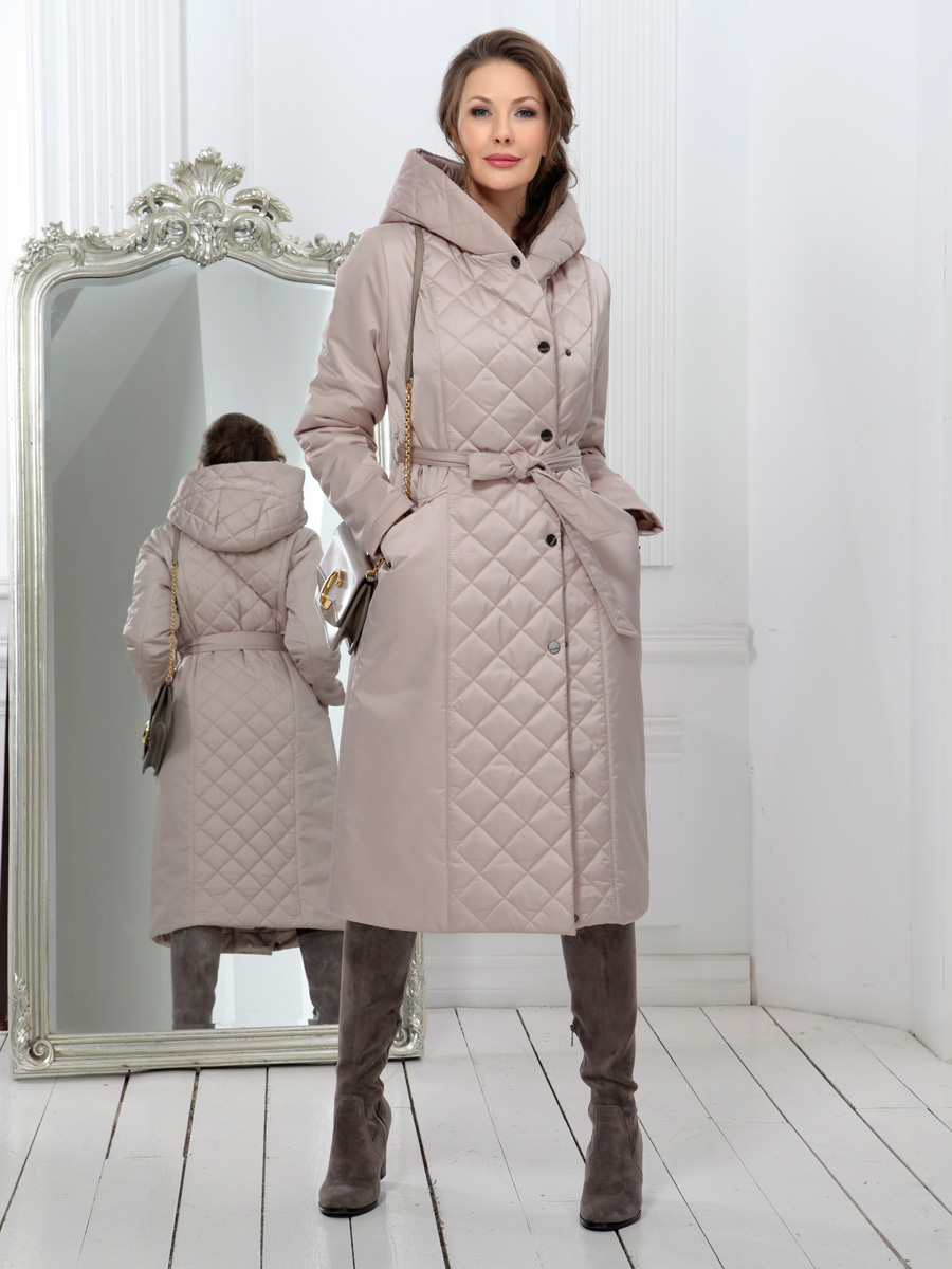 Женское демисезонное бежевое стеганое пальто большого размера от бренда Диззи вэй (Dizzy way). Длинное пальто прямого силуэта с капюшоном и смещенной застежкой на молнию и кнопки. Это демисезонное пальто подходит для женщин и девушек любого возраста. Свободный прямой силуэт можно легко изменить с помощью съемного завязывающегося пояса. Прорезные карманы с клапаном застегиваются на кнопку. Есть внутренний кармашек на молнии. Плащевая ткань имеет водоотталкивающую пропитку, которая выдержит небольшой осенний дождь или снег. Хорошо зарекомендовавший себя холлофайбер плотностью 220 гр/м защитит от холода и ветра. Подкладка в изделии выполнена из ткани в мелкую полоску.