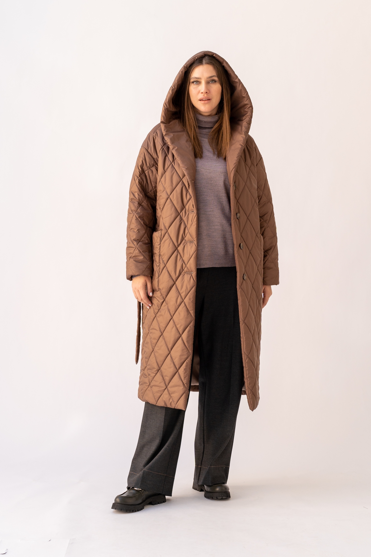 Женское бежевое демисезонное стеганое пальто с поясом больших размеров от бренда Модресс (Modress). Пальто прямого силуэта. Рукава спущенные. Капюшон втачной типа «шалька». Карманы накладные. Застегивается пальто на петли и пуговицы. Выполнено из стеганой курточной ткани с водоотталкивающей пропиткой.