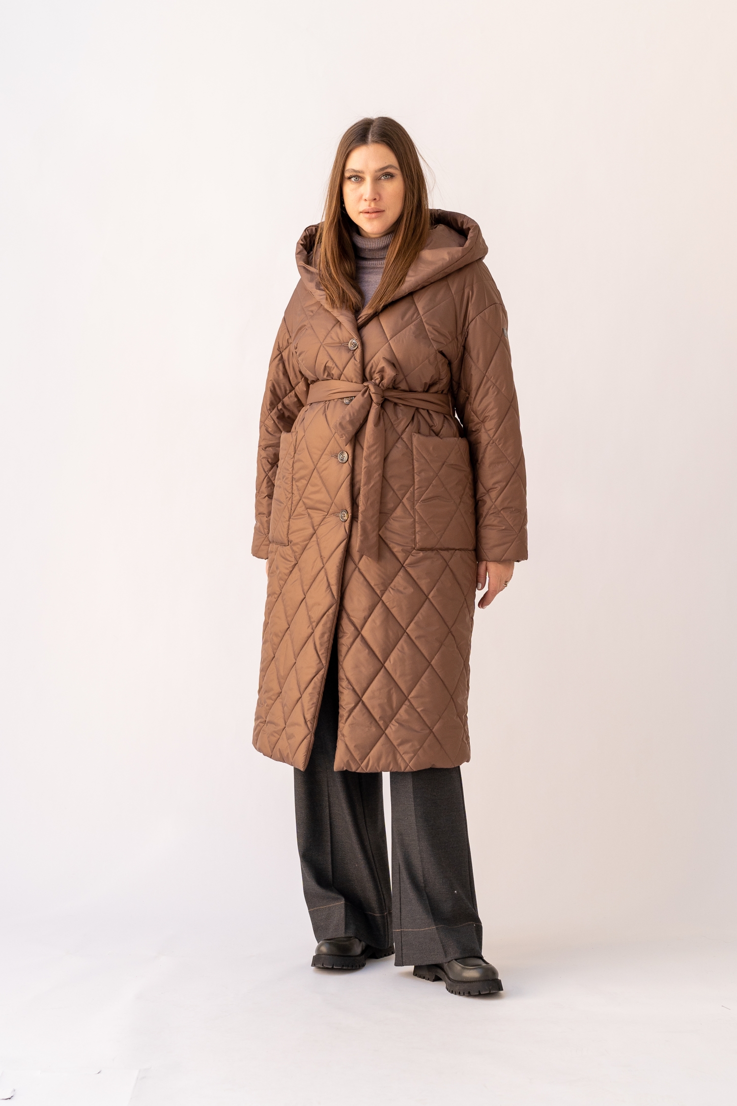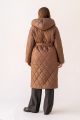 Описание: Женское темно-бежевое демисезонное стеганое пальто с поясом больших размеров от бренда Модресс (Modress). Пальто прямого силуэта. Рукава спущенные. Капюшон втачной типа «шалька». Карманы накладные. Застегивается пальто на петли и пуговицы. Выполнено из стеганой курточной ткани с водоотталкивающей пропиткой.