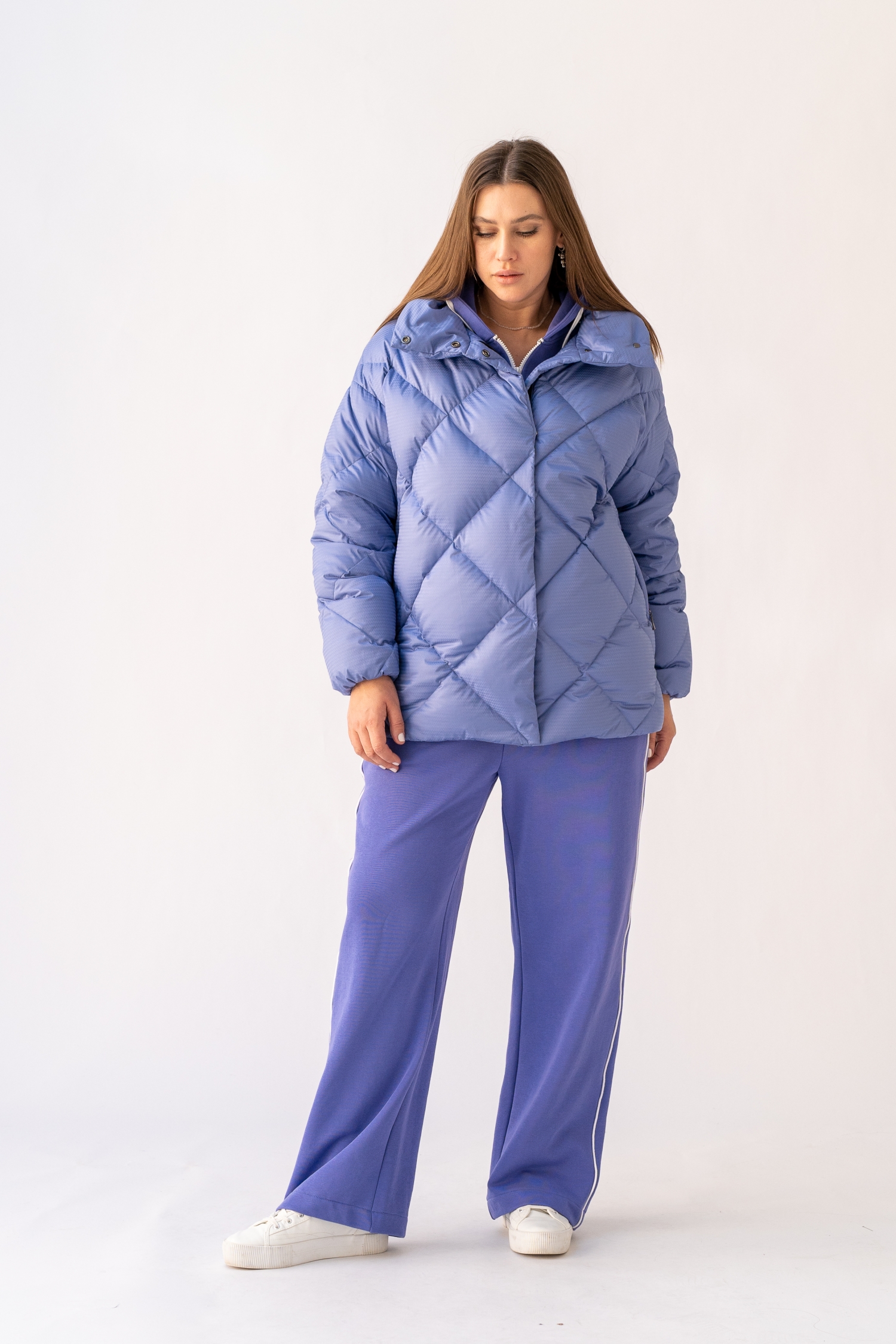 Женская сиреневая зимняя куртка прямого силуэта больших размеров от бренда Модресс (Modress). Куртка со пущенным плечевым поясом, воротник –высокая пухлая стойка. Капюшон съемный со стойкой, застегивается на кнопки. Рукава внизу присобраныэластичной строчкой. Боковые карманы прорезные «в рамку», застегиваются на молнии. Изделие застегивается на внутреннюю молнию и кнопки. Курточная ткань с водоотталкивающей пропиткой простегана крупными ромбами.