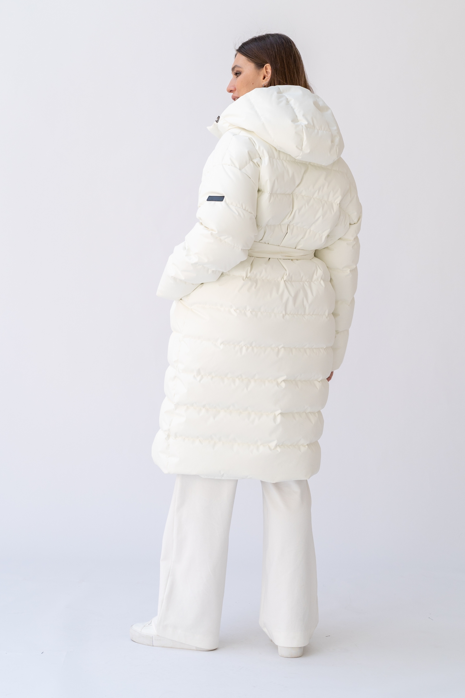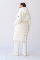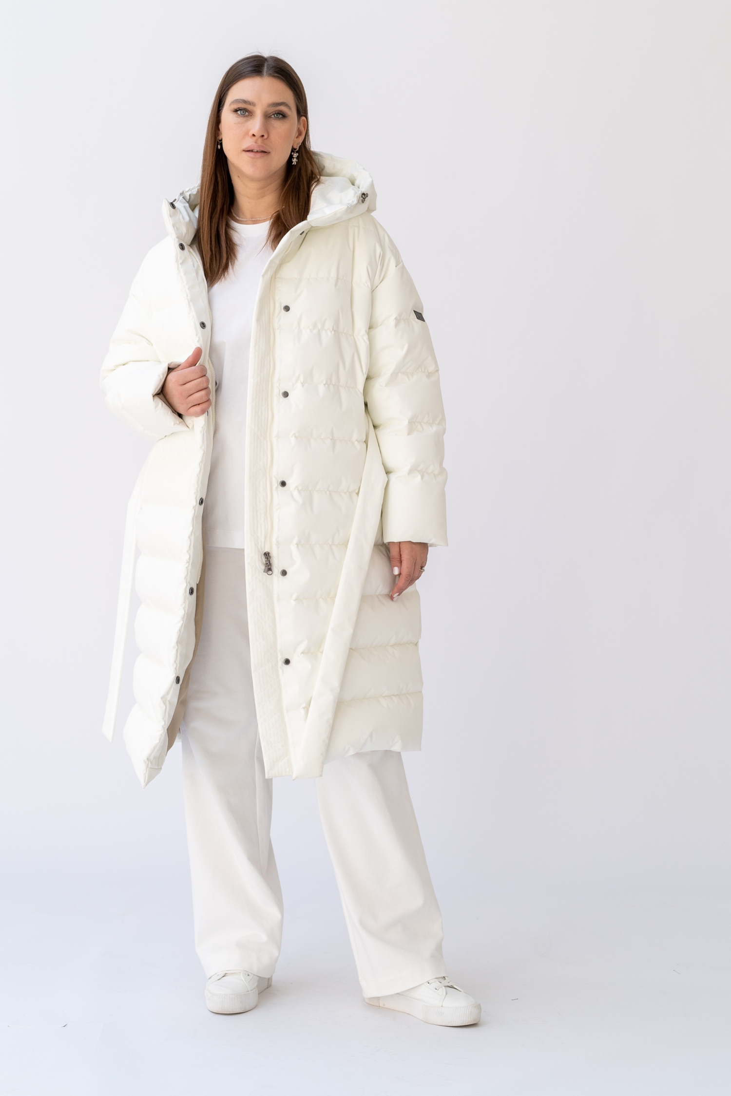 Женское белое зимнее длинное пуховое пальто больших размеров от бренда Модресс (Modress). Капюшон втачнойна небольшой стойке. Рукава спущенные. Карманы прорезные с листочками. Пальто без нагрудных вытачек, но, благодаря особому распределению прибавки, обладает хорошей посадкой. Изделие застегивается на внутреннюю тракторную молнию и потайные кнопки. Есть съемный пояс. Пальто выполнено из курточной ткани с мембраной.