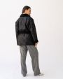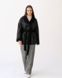 Женская короткая дубленка прямого кроя со спущенным плечевым поясом больших размеров от бренда Modress. Воротник английский с лацканами. Карманы накладные. Длина изделия чуть ниже бедер. Есть съемный пояс. Дубленка застегивается на петли и пуговицы. Выполнена из искусственной замши под овчину в черном цвете.