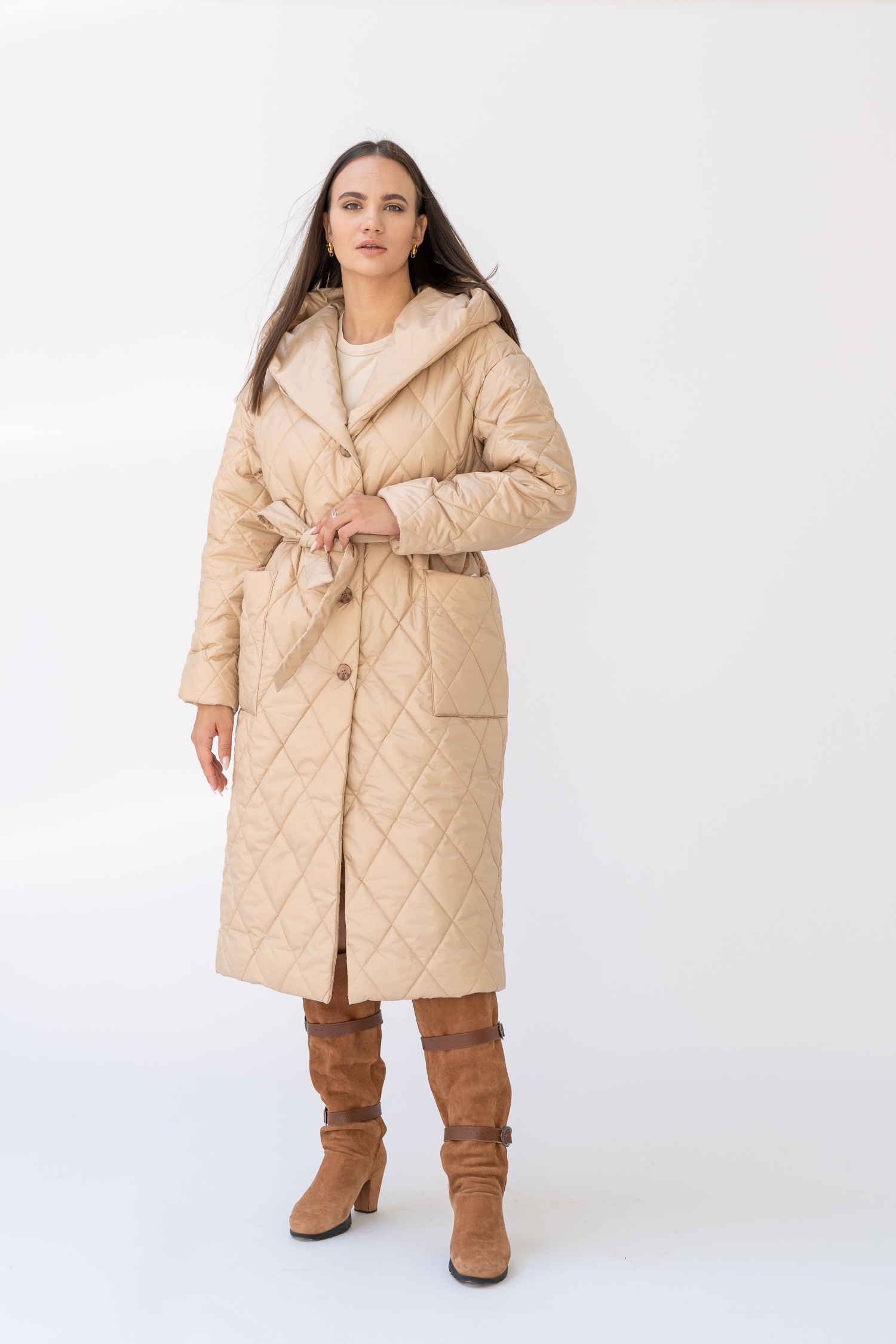 Женская зимняя молочная куртка больших размеров прямого силуэта от бренда Модресс (Modress). Воротник -стойка. Есть съемный капюшон со стойкой, который застегивается на кнопки. Рукава втачные, двухшовные. Карманы выполнены в рельефных швах и застегиваются на потайные молнии. Нагрудная вытачка обеспечивает хорошую посадку. Куртка застегивается на металлическую молнию.