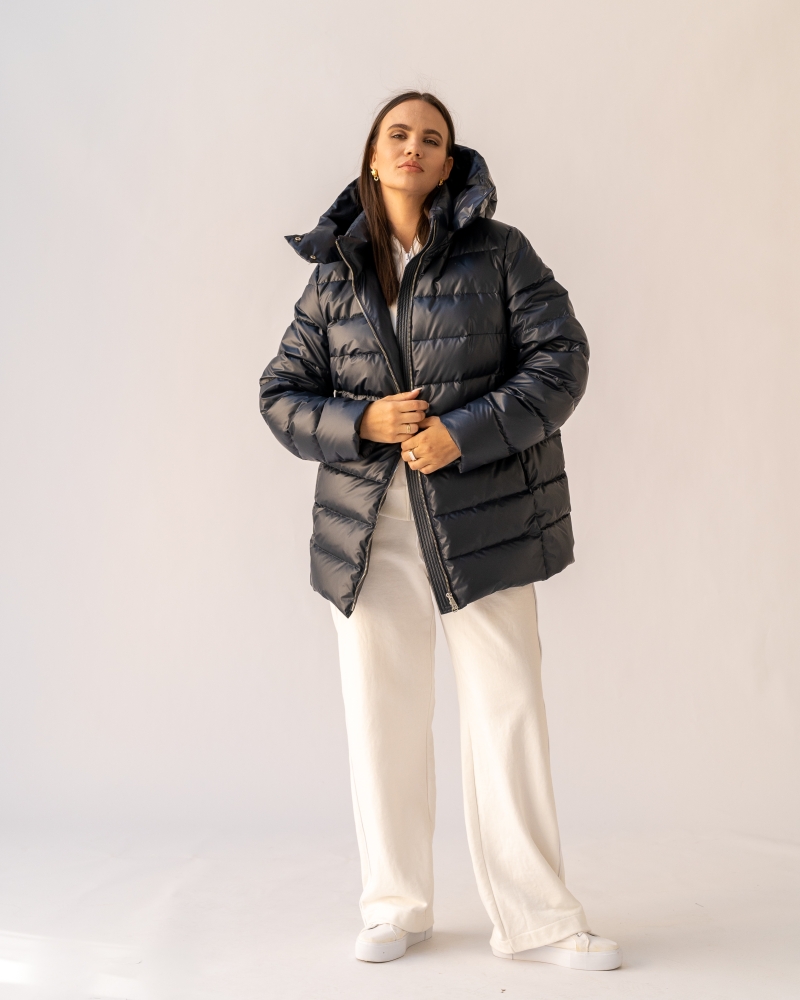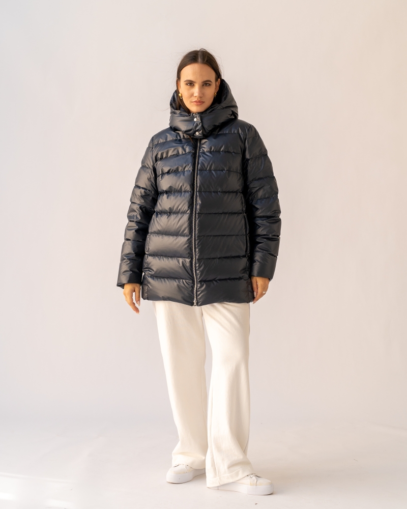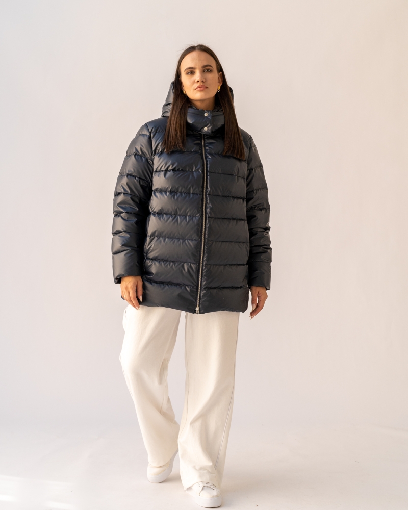 Женская зимняя темно-синяя куртка больших размеров прямого силуэта от бренда Модресс (Modress). Воротник -стойка. Есть съемный капюшон со стойкой, который застегивается на кнопки. Рукава втачные, двухшовные. Карманы выполнены в рельефных швах и застегиваются на потайные молнии. Нагрудная вытачка обеспечивает хорошую посадку. Куртка застегивается на металлическую молнию.