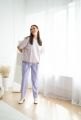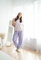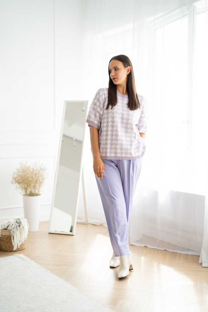 Женский сиреневый вязаный блузон типа Т-shirt с коротким рукавом больших размеров от бренда Modress. Объемный оверсайз со спущенным плечевым поясом. Вырез горловины круглый. Выполнен в четырех цветах: сливочный, св. голубой, принт бежево-сливочный и принт сиренево-молочный.