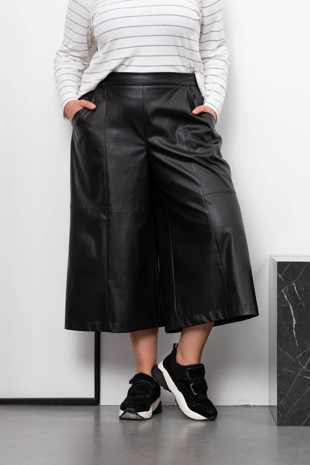 Описание: Женские черные брюки кюлоты из экокожи больших размеров от бренда intikoma