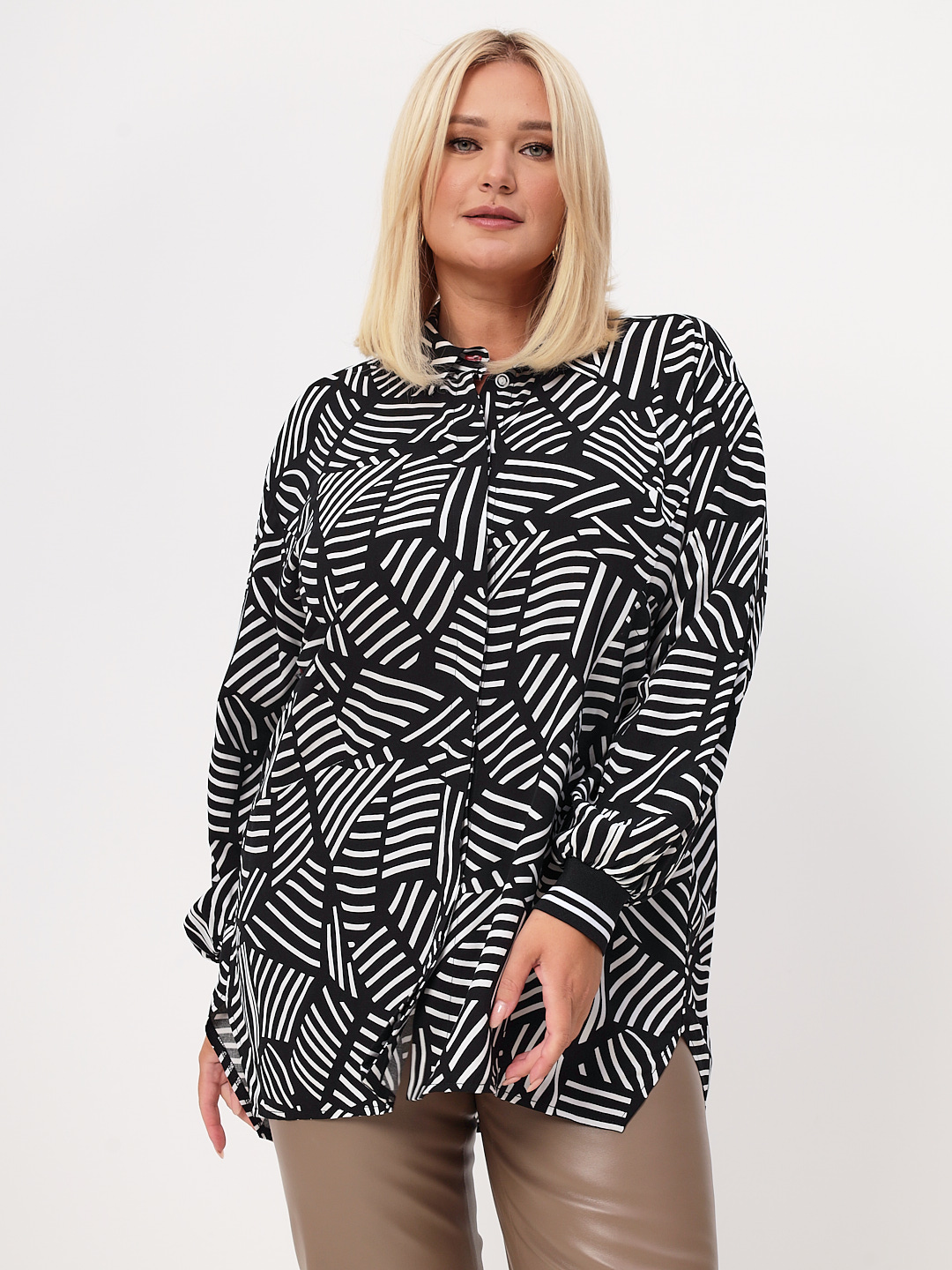 Женская черная удлиненная блузка больших размеров с геометрическим принтом из вискозы от бренда intikoma (Интикома). Удлиненная блузка идеальная база в Вашем гардеробе. Прямой крой делает образ лаконичным. Абстрактный принт добавляет образу динамики.Модель станет основой городских повседневных комплектов и будет уместна в офисе, на прогулке, на встрече. Детали: прямой удлиненный силуэт, центральная супатнаязастежка на пуговицах, спущенная линия плеча, рубашечный воротник, широкий рукав на эластичной манжете,по спинке складка. Блузка представлена в двух цветах коричневом и черном.