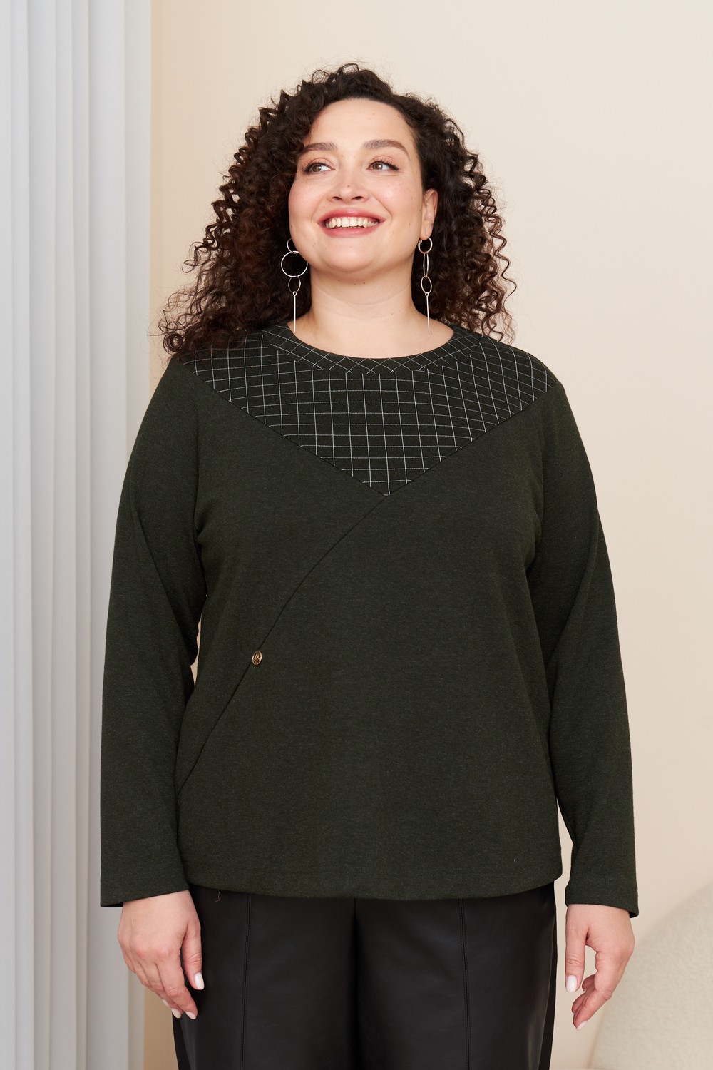Женский джемпер больших размеров в цвете хаки в стиле спорт шик с кармашком от бренда intikoma (Интикома). Оригинальная и удобная модель в стиле спорт-шик. Теплый, приятный к телу материал, согреет Вас в прохладную погоду. Модель гарантирует комфорт и отличное настроение. Детали: прямой силуэт, округлая горловина, на планке, диагональный подрез по переду с карманом в шве.V-образная кокетка в клетку по спинке и переду придает динамику джемперу, полная длина рукава.