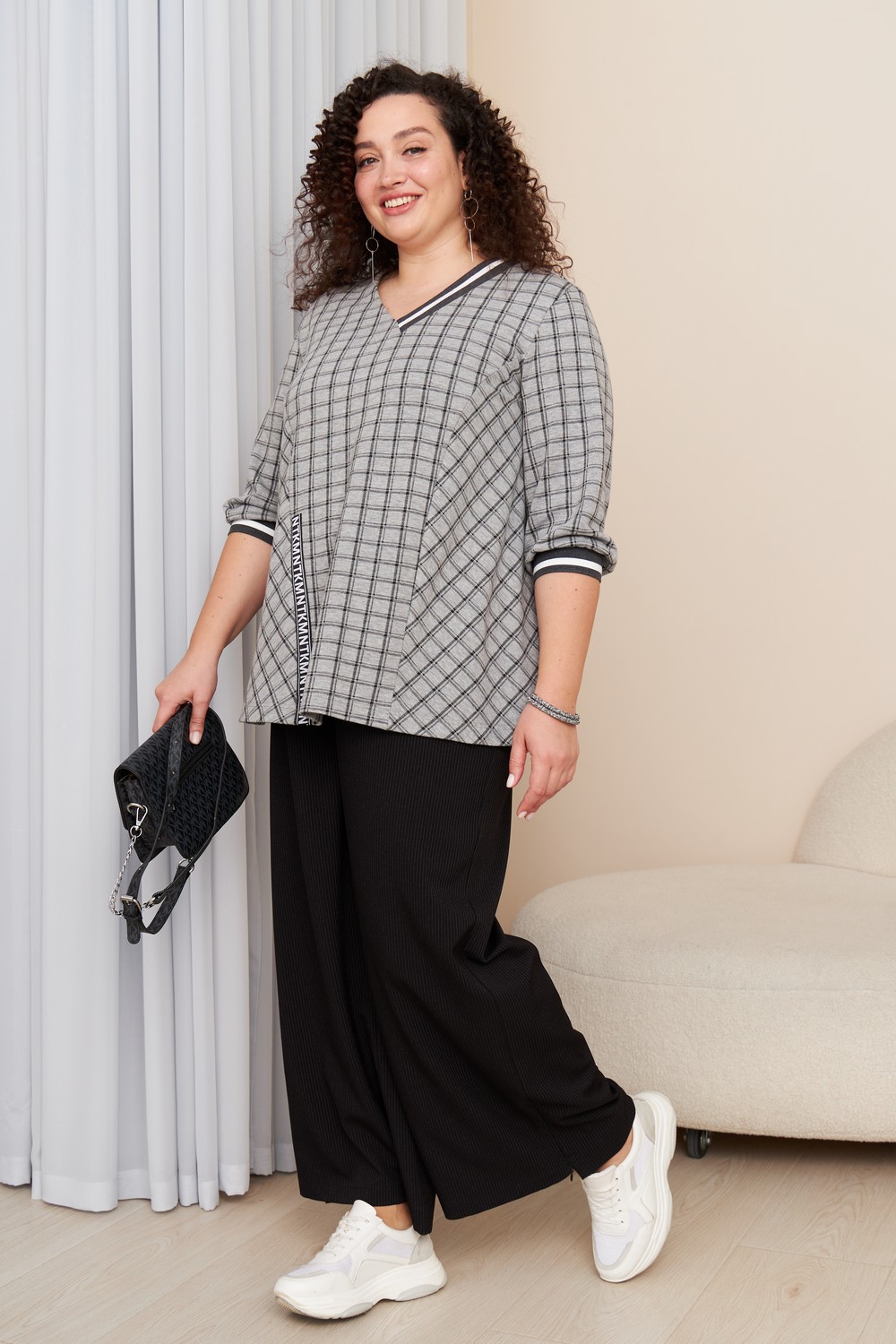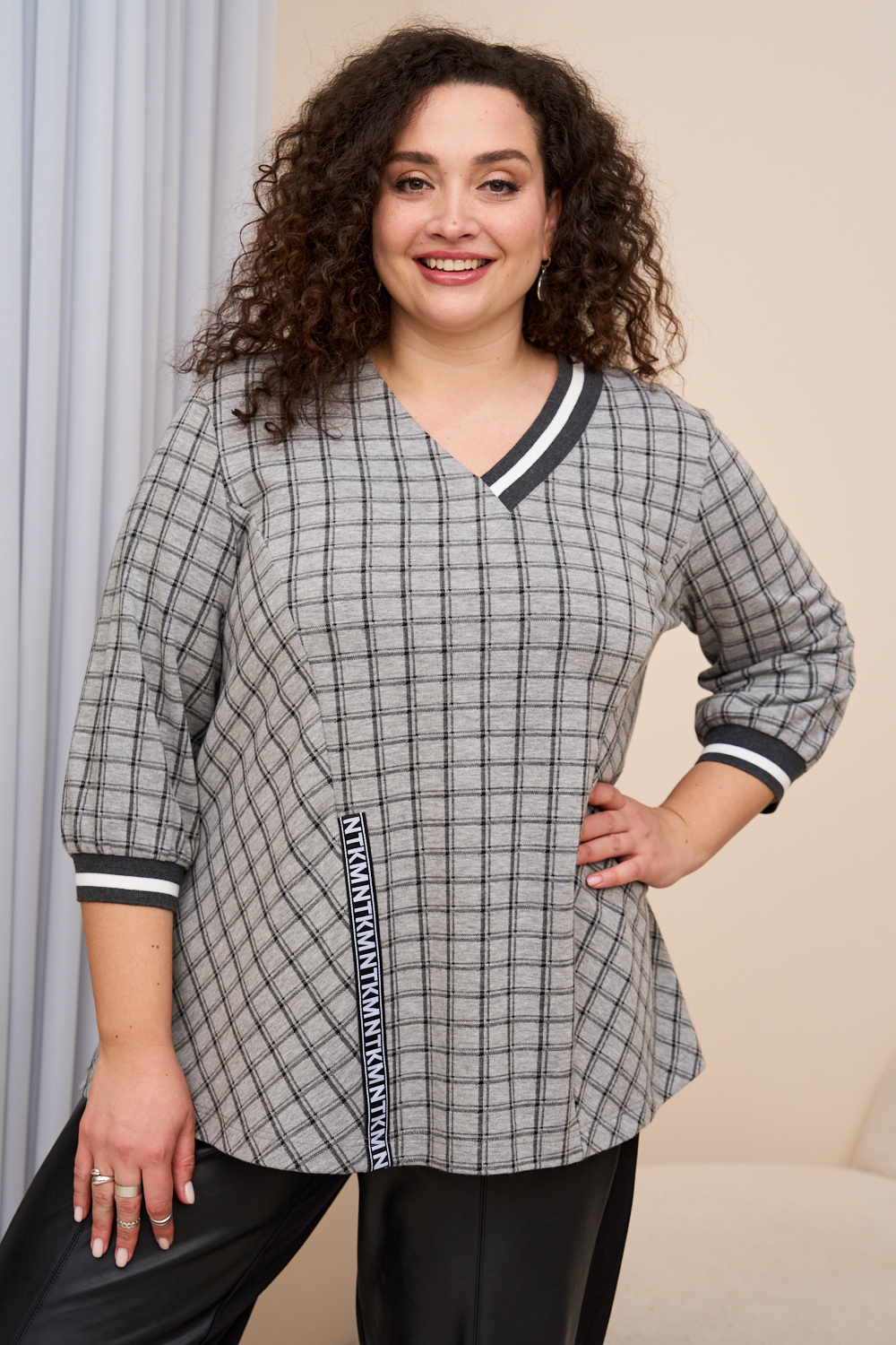 Описание: Женский серый джемпер больших размеров в клетку А-силуэта от бренда intikoma (Интикома). Модный джемпер А-силуэта, подарит легкость и комфорт на целый день. Разнонаправленный принт клетка добавляет джемперу динамику. По переду настрочена фирменная декоративная лента, а так же эластичный подвяз на манжете и горловине только усиливает эксклюзивность модели. Детали: V- образный вырез ассиметрично украшает подвяз, рукав ¾ на манжете.