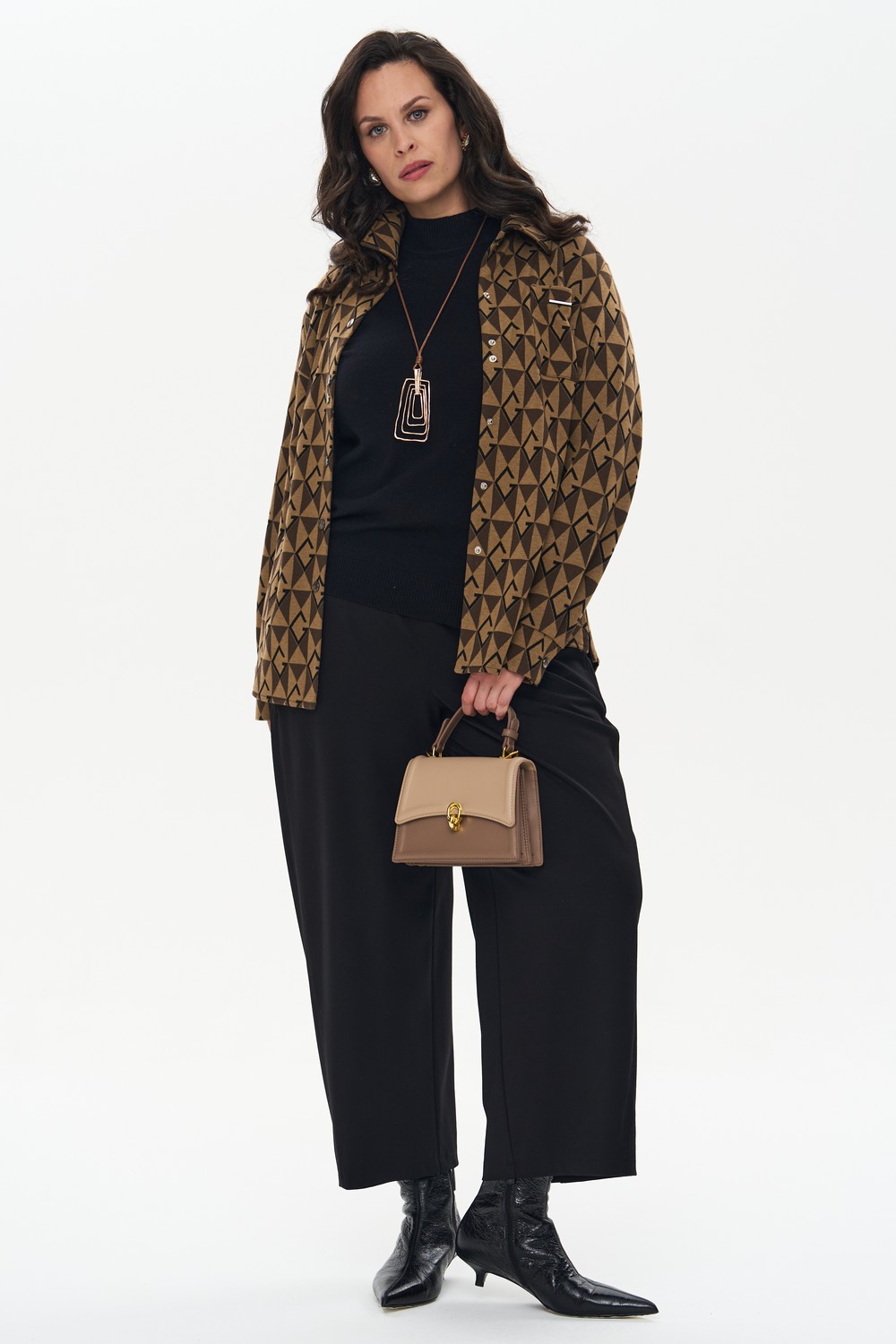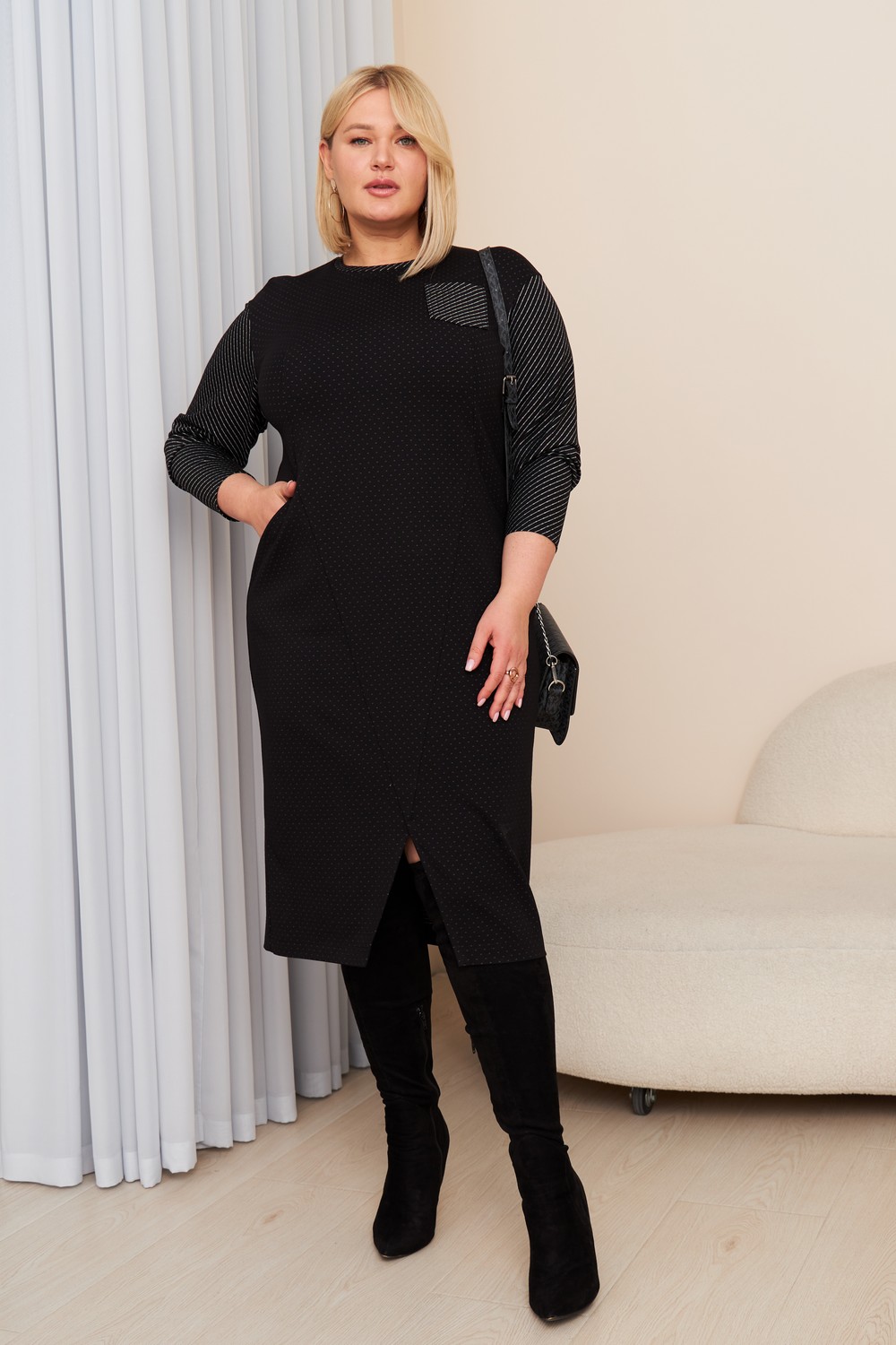 Женское черное платье больших размеров длиной миди в мелкую точку от бренда intikoma (Интикома). Платье миди необычного кроя, по переду с разрезом. Лаконичное решение для Вашего гардероба. Платье выполнено из эластичной вискозы с добавлением полиэстера для износостойкости. Прилегающий силуэт и натуральный состав обеспечит комфорт. Комбинация цветов выглядит изящно и добавляет динамику. Детали: прилегающий силуэт, длинный рукав,округлая горловина, декоративный нагрудный карман, функциональные карманы в рельефах, разрез по переду.