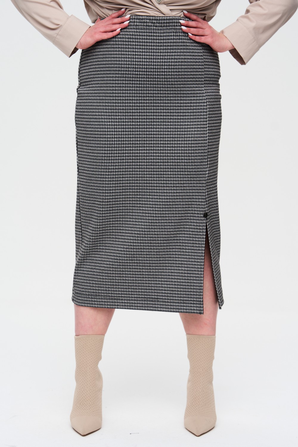 Женская серая в клетку миди юбка карандаш больших размеров из трикотажной вискозы от бренда intikoma (Интикома). Изящный крой и модная расцветка придают силуэту стройность. Юбка без подклада. Модель идеальна для городского гардероба и будет актуальна в холодной время года. Детали: эластичный пояс на резинке подарит комфорт. Разрез в рельефе впереди придает движению свободу и легкость в походке.