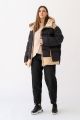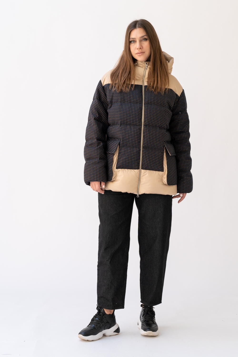 Женский зимний сине-бежевый пуховик больших размеров от бренда Модресс (modress). Пуховик прямого кроя со спущенным плечевым поясом. Капюшон втачной на высокой стойке. Боковые карманы накладные, типа «портфель», с клапанами. Куртка застегивается на металлическую молнию. В модели комбинируются два вида ткани: твид темно-синего цвета и курточная ткань светло бежевого цвета.