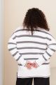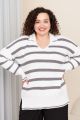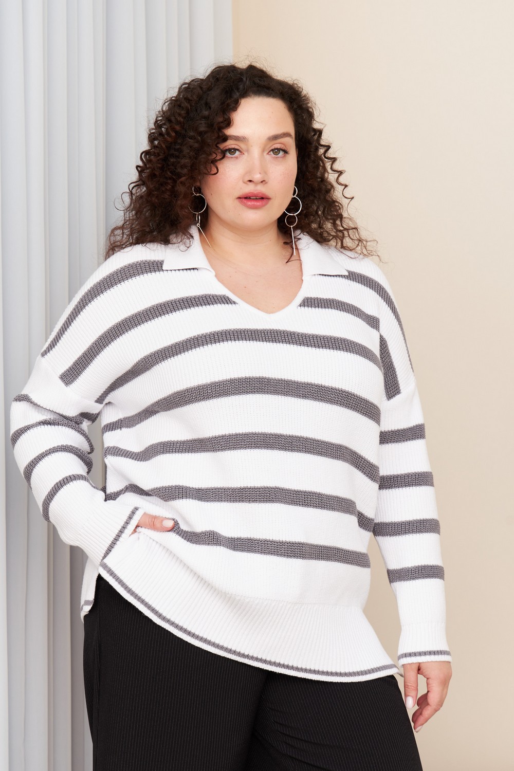 Женский черный в полоску джемпер больших размеров с воротником поло из трикотажа от бренда intikoma (Интикома). Стильный оверсайз джемпер с ультрамодным воротником поло, выполнен из мягкого трикотажа на основе вискозы с добовлением кашемира, приятен к телу и комфортный в носке. Свободный крой подходит для любого типа фигуры, V-образный вырез горловины придает пикантность образу, по бокам джемпера разрезы. Модель представленна в двух цветах в бежевой полоске и серой полоске.