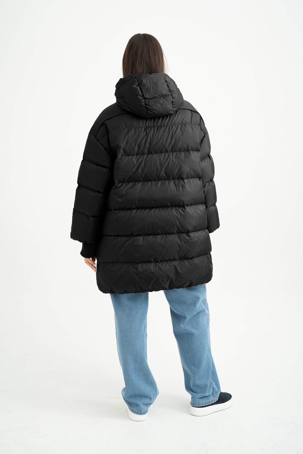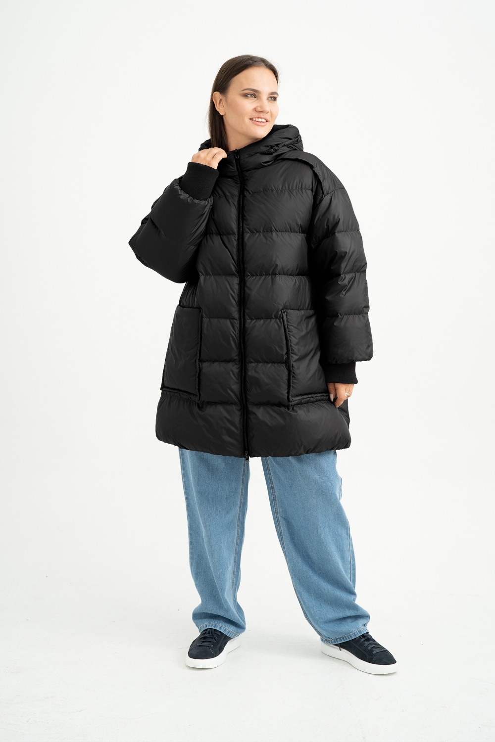 Женская черная зимняя куртка больших размеров на пуху от бренда modress (Модресс). Куртка свободного кроя со спущенным плечевым поясом. Рукава широкие, свободные с высокими трикотажными манжетами. Капюшон втачнойна небольшой стойке. На капюшоне выполнена декоративная кулиска. Карманы накладные, прямоугольной формы. Низ изделия и рукавов присобраны. Куртка застегивается на металлическую молнию. Пуховик выполнен из курточной ткани с водоотталкивающей пропиткой.