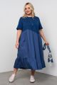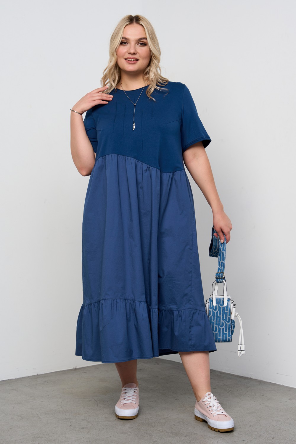 Женское летнее синее макси платье больших размеров из хлопка от бренда Интикома (Intikoma). Выполнено из трикотажной «кулирки»и текстильного хлопка, такой тандем тканей сделает образ модным, актуальным и незабываемым. Детали: свободный силуэт, подрез на талии и по низу в виде волны. Длина миди. Горловина округлая. Планка горловины и манжет рукава с «сырым срезом», такая обработка платье современным. По переду защипы в хаотичном расположении. Рукав короткий с манжетой. Модель платья представлена в трех актуальных расцветках зеленый, фиолетовый, синий.