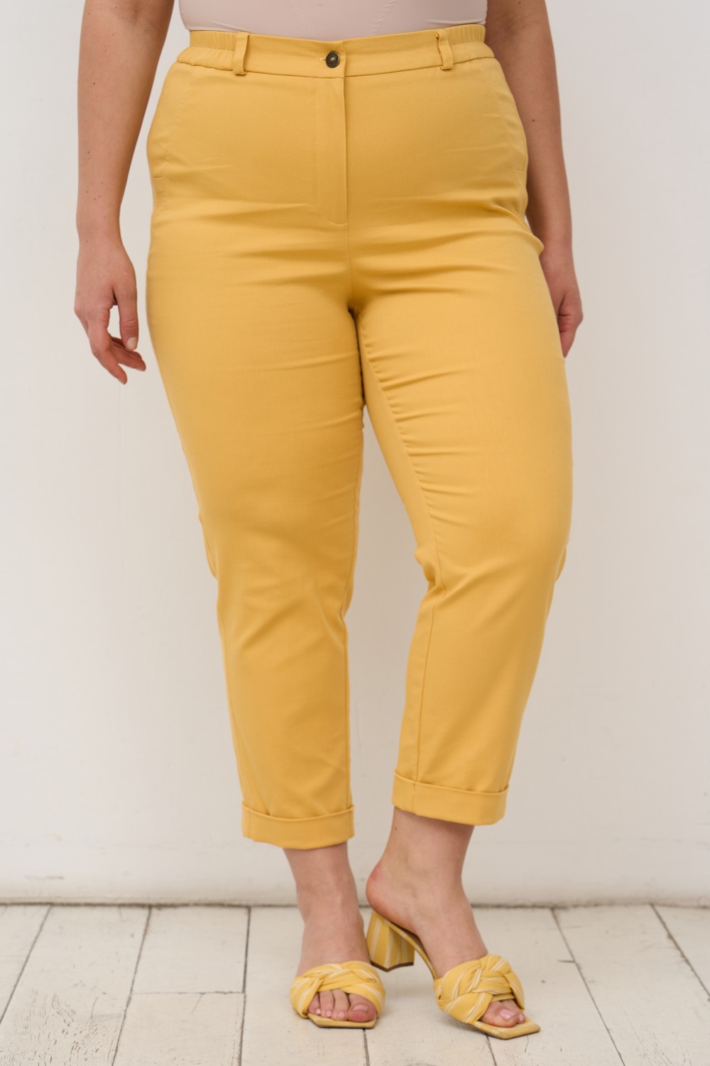 Женские горчичные зауженные книзу брюки больших размеров от бренда Интикома (Intikoma). Брюки выполнены из тактильно приятной, натуральной ткани с добавлением эластана. Детали: укороченная длина, спереди - имитация карманов, пояс частично на резинке, застежка молния и пуговица, шлевки по поясу для возможности использовать ремень. По спинке накладные карманы, фигурная кокетка. С брюками не составит труда создать стильный образ и всегда оставаться в тренде.