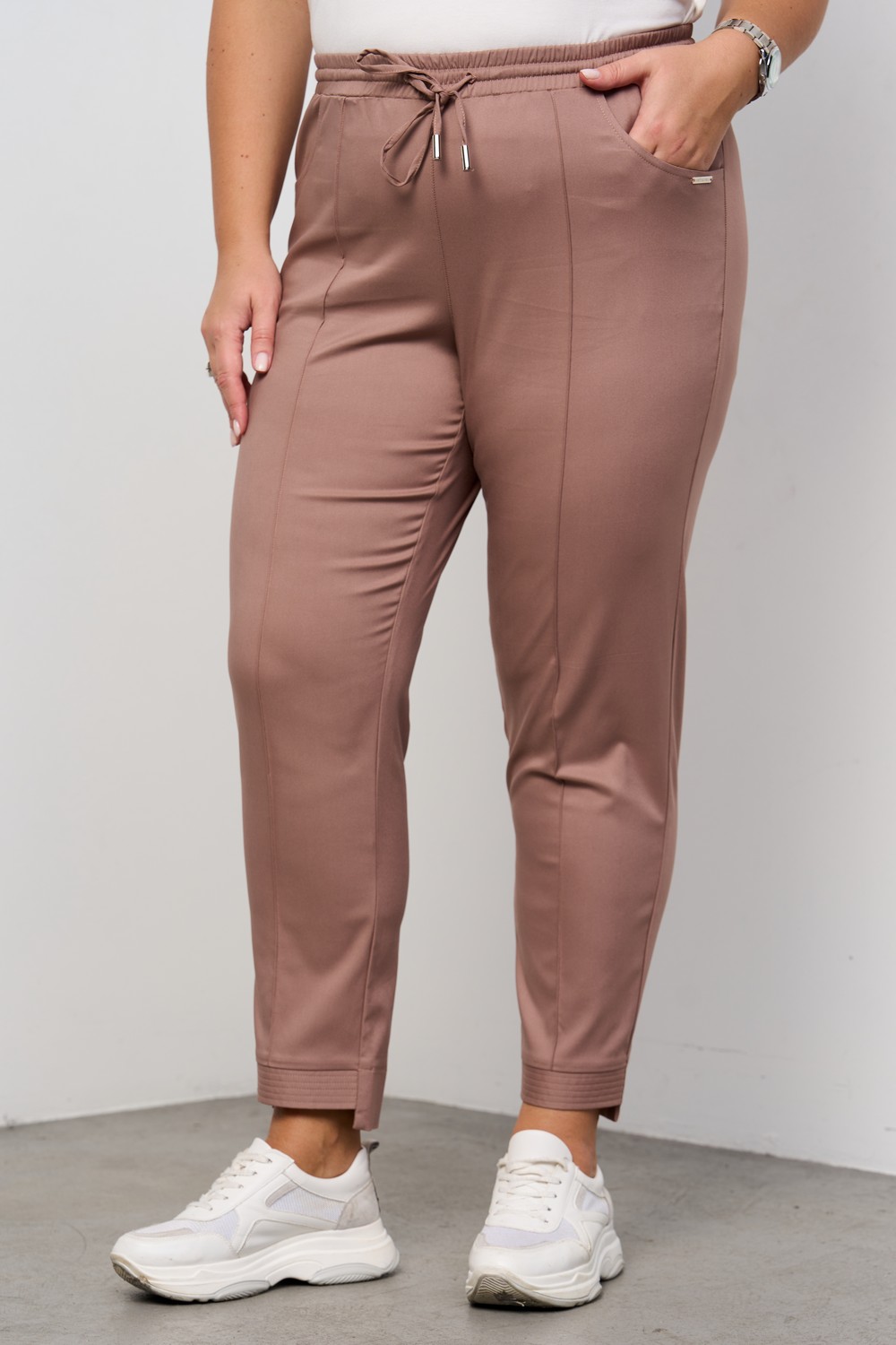 Женские зауженные брюки больших размеров в цвете капучино со стрелками от бренда Интикома (Intikoma). Защипы по переду визуально вытягивают силуэт, пояс на резинке дарит комфорт при носке. Карманы по переду функциональные.