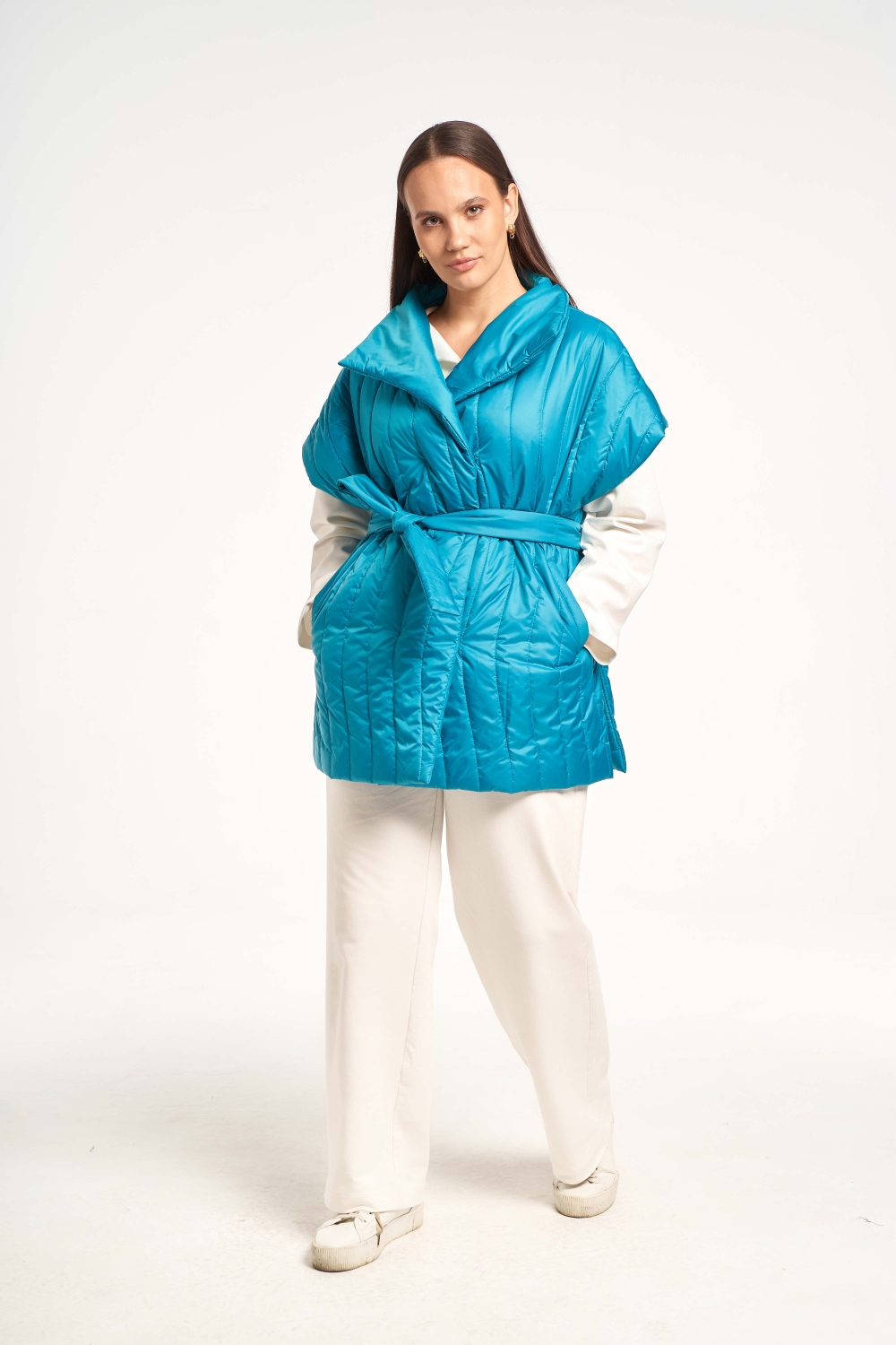 Женский демисезонный изумрудный жилет больших размеров свободного кроя со спущенными плечами от бренда Модресс (Modress). Воротник цельнокроеный типа «апаш». Боковые карманы прорезные с листочкой. В боковых швах выполнены высокие разрезы. Есть съемный пояс. Жилет выполнен из стеганой курточной ткани.