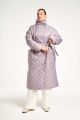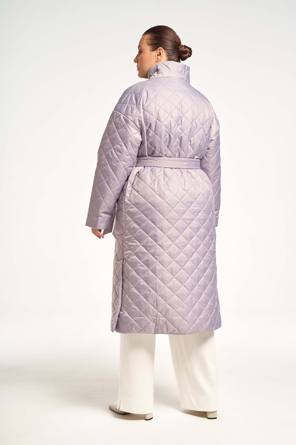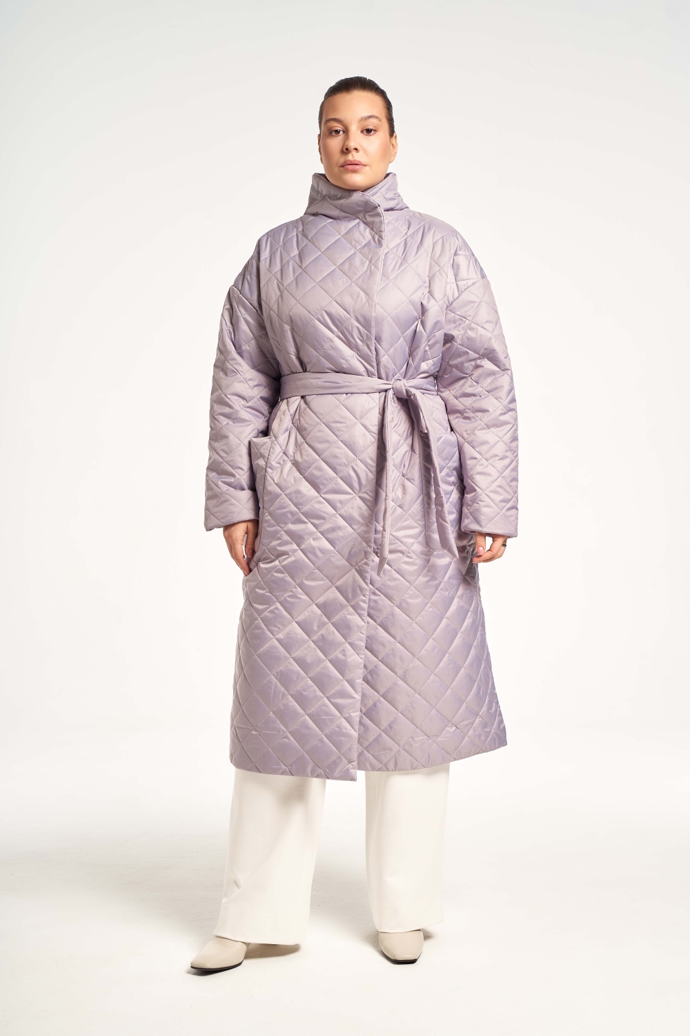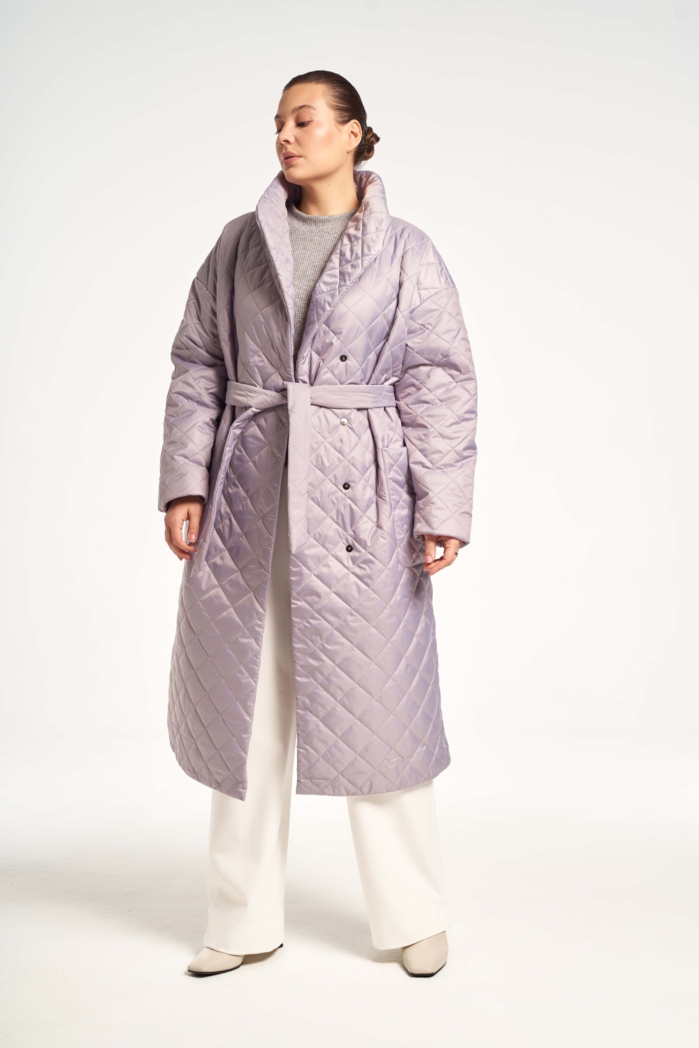 Женское демисезонное длинное стеганое серое пальто больших размеров от бренда Модресс (Modress). Пальто-халат прямого силуэта с поясом. Рукава спущенные. Воротник цельнокроеный типа «апаш». Карманы накладные. В боковых швах выполнены шлицы на потайных кнопках. Застегивается пальто так же - на потайные кнопки. Пальто изготовлено из стеганой курточной ткани с водоотталкивающей пропиткой.
