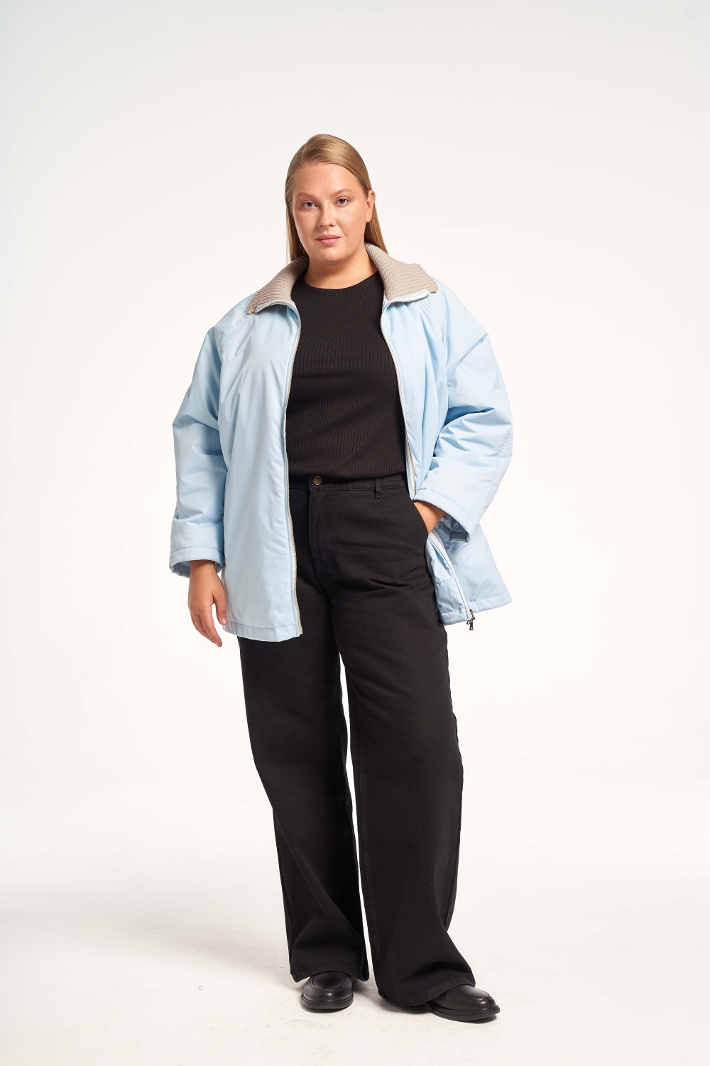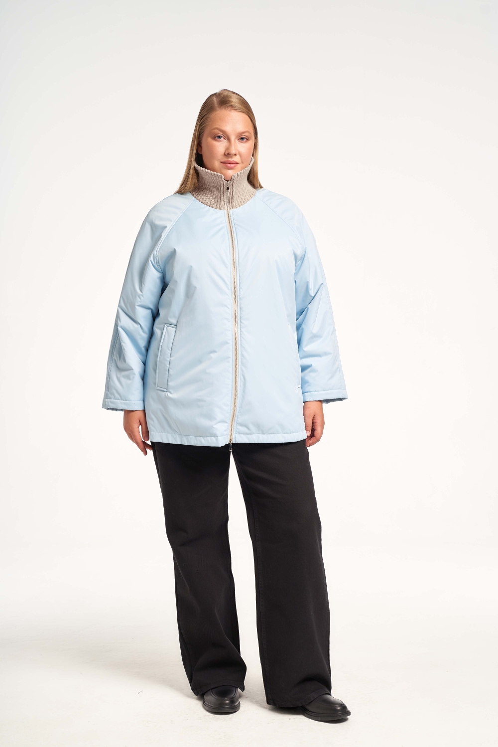 Женская демисезонная голубая куртка больших размеров свободного кроя от бренда Модресс (Modress). Объемная куртка прямого силуэта, длиной ниже линии бедер. Воротник - трикотажная высокая стойка. Рукава реглан с заглубленной проймой. Боковые карманы прорезные с листочками. В боковых швах невысокие разрезы. Изделие застегивается на металлическую молнию. Выполнена из курточной ткани с водоотталкивающей пропиткой.