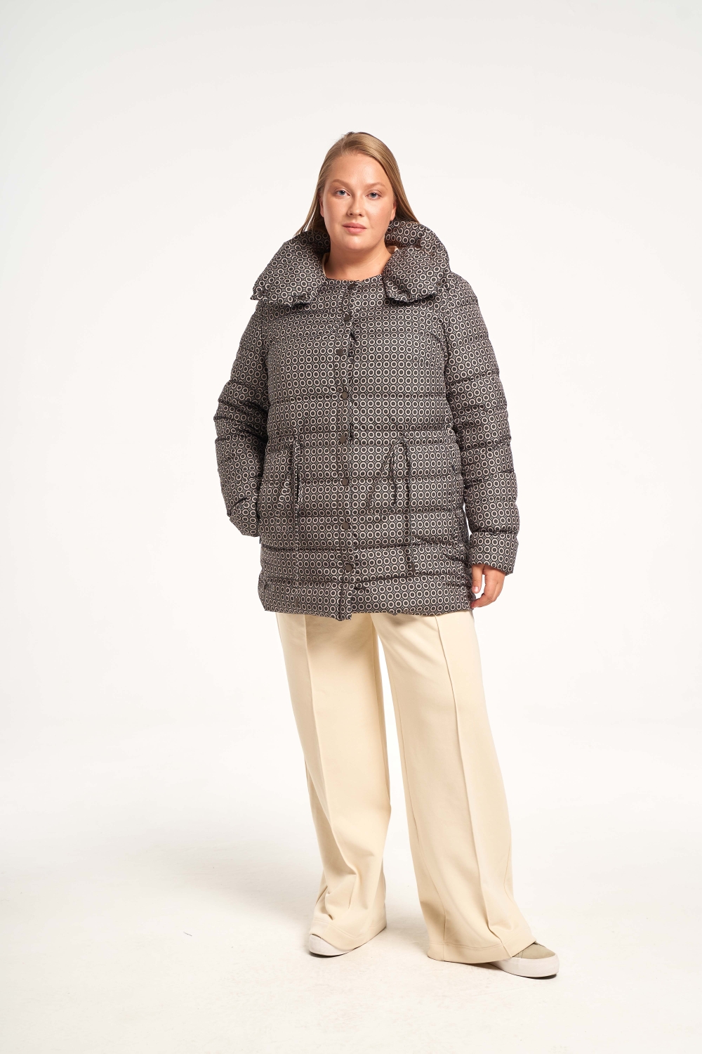 Женская демисезонная черная с принтом куртка больших размеров прямого силуэта с кулиской на талии от бренда Модресс (Modress). Куртка длиной ниже линии бедер. Воротник –пухлая высокая стойка. Рукава втачные, двухшовные. Карманы выполнены в рельефных швах и застегиваются на потайные молнии. Нагрудная вытачка обеспечивает хорошую посадку. Куртка застегивается на декоративные кнопки.