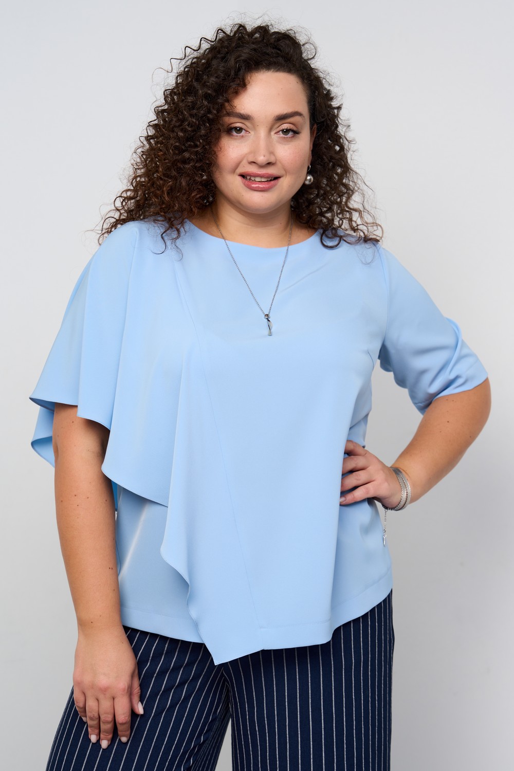 Описание: Женская голубая блузка больших размеров с ассиметричным кроем из вискозы от бренда Интикома (Intikoma). Мягкая, приятная, струящаяся ткань с содержанием вискозы, создает безупречный фасон стильной модели. Детали: ассиметричный крой блузки, деталь волана придает воздушность и загадку образу, рукав длиной ¾, горловина округлая. Блузка представлена в двух цветах в оттенке пыльной розы и нежном голубом.
