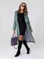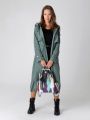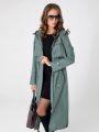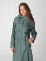 Женский демисезонный серо-зеленый длинный плащ больших размеров А-образного силуэта от бренда Диззи вэй (Dizzy way). Плащ с рукавами покроя реглан, застежкой на двухзамковую молнию и отлетными кокетками по спинке и полочке. Воротник - стойка, переходящая в капюшон. Внешние и один внутренний карманы застегиваются на молнию. Прилегание по талии обеспечивается с помощью эластичной ленты и кулиски. Ширину по низу изделия можно регулировать затяжкой, тем самым меняя силуэт плаща.