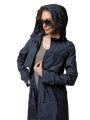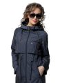 Женский демисезонный темно-графитовый длинный плащ больших размеров А-образного силуэта от бренда Диззи вэй (Dizzy way). Плащ с рукавами покроя реглан, застежкой на двухзамковую молнию и отлетными кокетками по спинке и полочке. Воротник - стойка, переходящая в капюшон. Внешние и один внутренний карманы застегиваются на молнию. Прилегание по талии обеспечивается с помощью эластичной ленты и кулиски. Ширину по низу изделия можно регулировать затяжкой, тем самым меняя силуэт плаща.