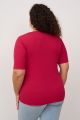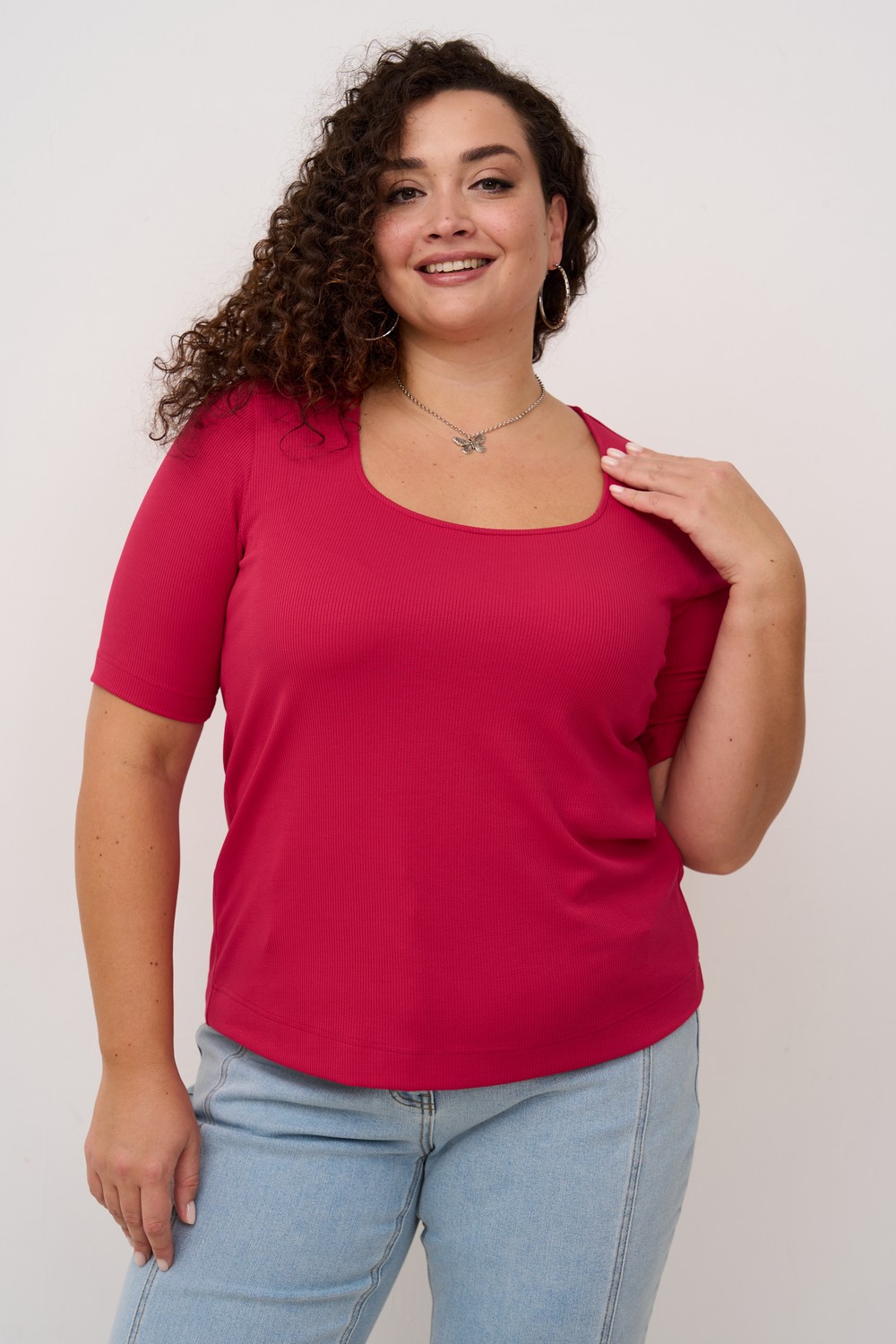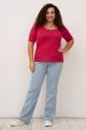Женская базовая блузка больших размеров в цвете фуксия с коротким рукавом из трикотажа в рубчик от бренда Интикома (Intikoma). Модель идеально подойдет к любому образу. Детали: прилегающий силуэт, П-образная горловина придаст пикантности Вашему образу. Короткий рукав. Модель представлена в трех цветах фуксия, зеленый, молочный.