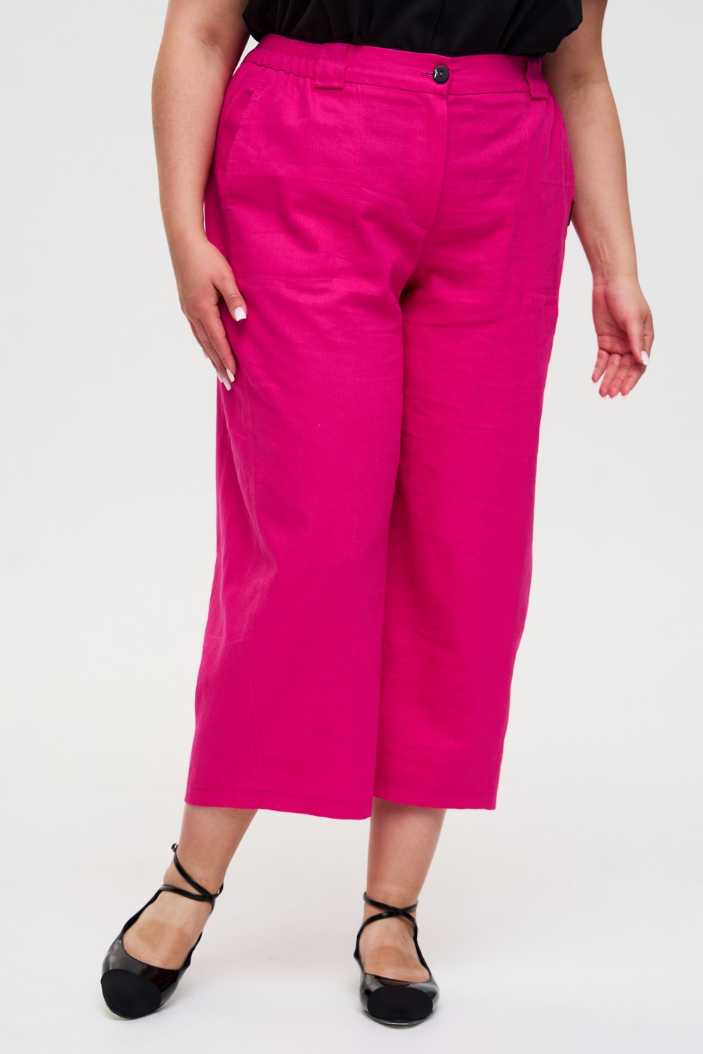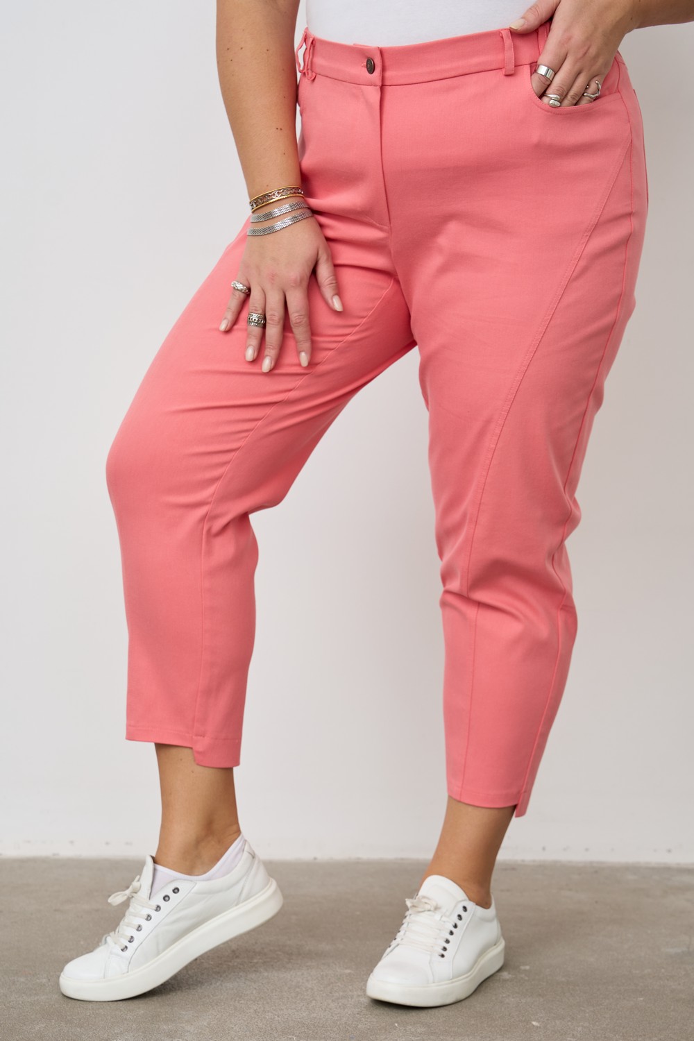 Женские розовые брюки бананы больших размеров от бренда Интикома (Intikoma). Брюки женские типа бананы с функциональными карманами по переду. Вдоль карманов расположена декоративная отделочная строчка. Застежка – пуговица на поясе, гульфик на молнии. Пояс притачной частично на резинке. По переду фигурные рельефы. Трендовый акцент – небольшой перепад длины брюк по низу. По спинке кокетка и накладные карманы. Модель брюк представлена в двух цветах: сложном оттенке полыни и классическом белом.