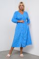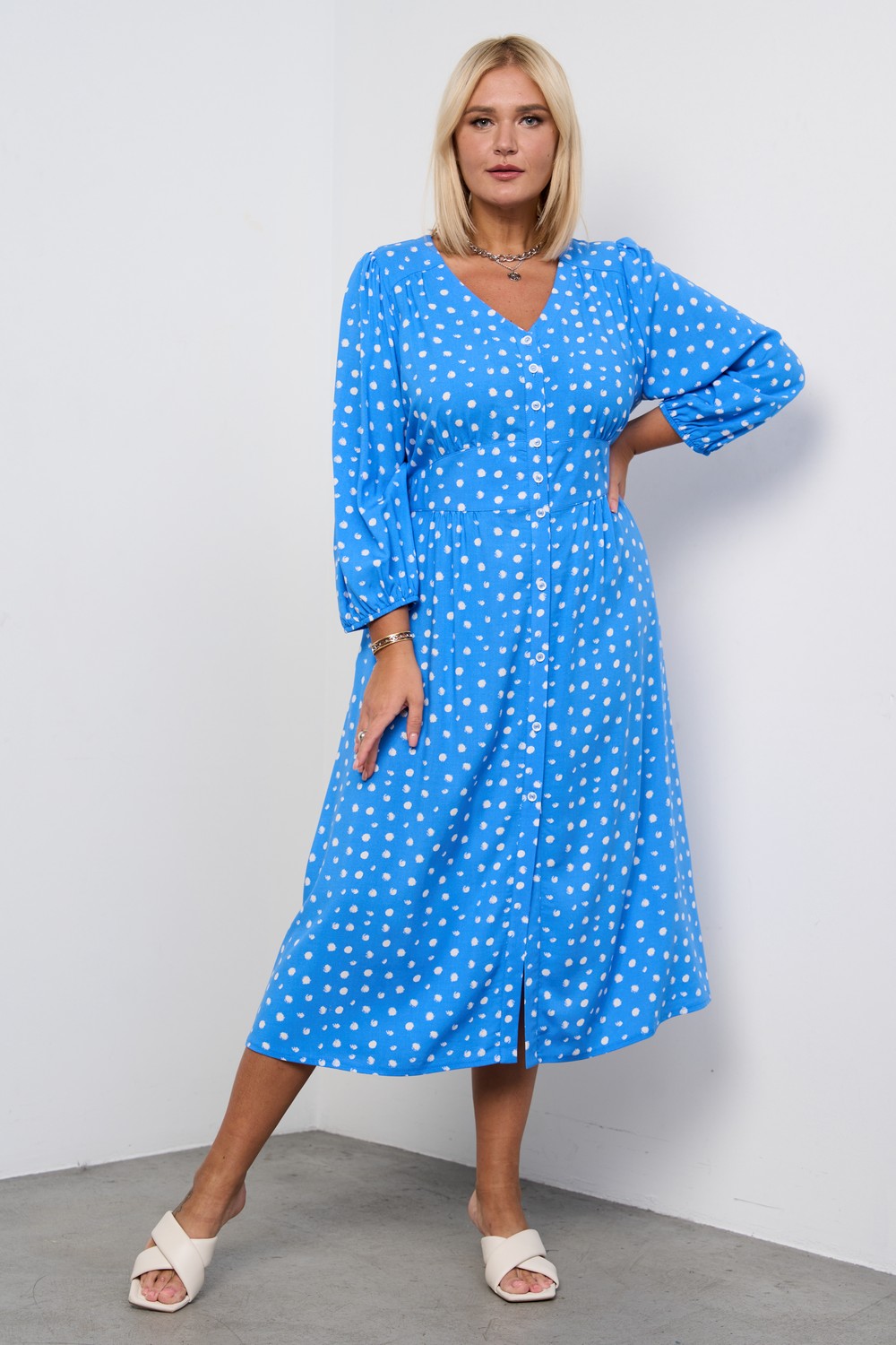 Женское голубое в белый горошек миди платье большого размера от бренда Интикома (Intikoma). Детали: V-образный вырез горловины, застежка центральная на пуговицах, подрезная кокетка по талии, по спинке подрез по талии на резинке. Рукав длиной 7/8 на резинке по низу.