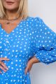 Описание: Женское голубое в белый горошек миди платье большого размера от бренда Интикома (Intikoma). Детали: V-образный вырез горловины, застежка центральная на пуговицах, подрезная кокетка по талии, по спинке подрез по талии на резинке. Рукав длиной 7/8 на резинке по низу.