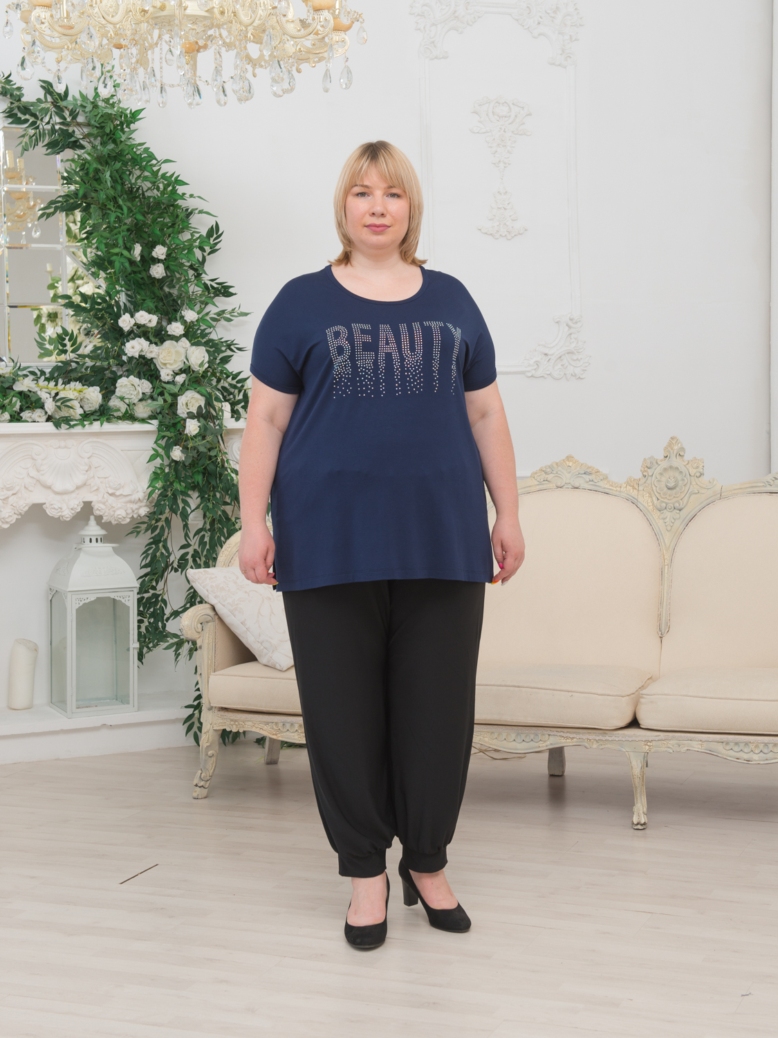 Описание: Женская темно-синяя футболка больших размеров со стразами из вискозы от бренда русское поле