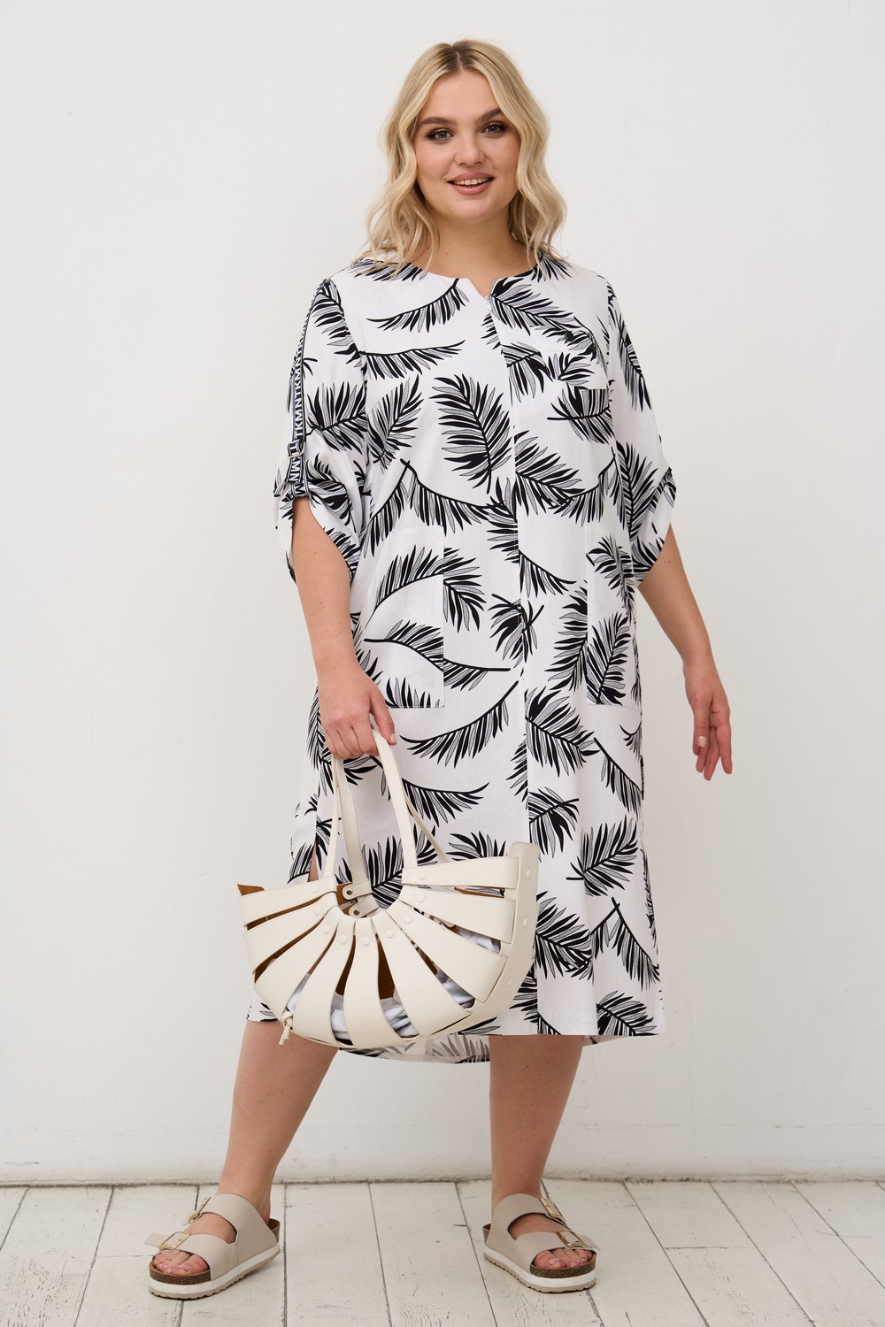 Женское бело-черное свободное платье большого размера с растительным принтом из льна и хлопка от бренда Интикома (Intikoma). А-образный крой дарит свободу движения и, вместе с этим выгодно обыгрывает фигуру и балансирует ее очертания, скрывая возможные несовершенства.У модели округлая горловина, декорированная уступом с застежкой на молнию по переду. Разрезы по бокам обеспечат свободу движения. Рукава с декоративной лентой и полукольцами дают возможность укоротить длину и пофантазировать с силуэтом. На полочке три функциональных кармана, на спинке – декоративный клапан. Линия низа платья - фигурная. Абсолютный тренд – чуть удлиненный и слегка закругленный низ спинки. Платье выполнено из текстиля высокого качества, в составе которого лён и хлопок. Модель комфортная в носке, с хорошим воздухообменом.