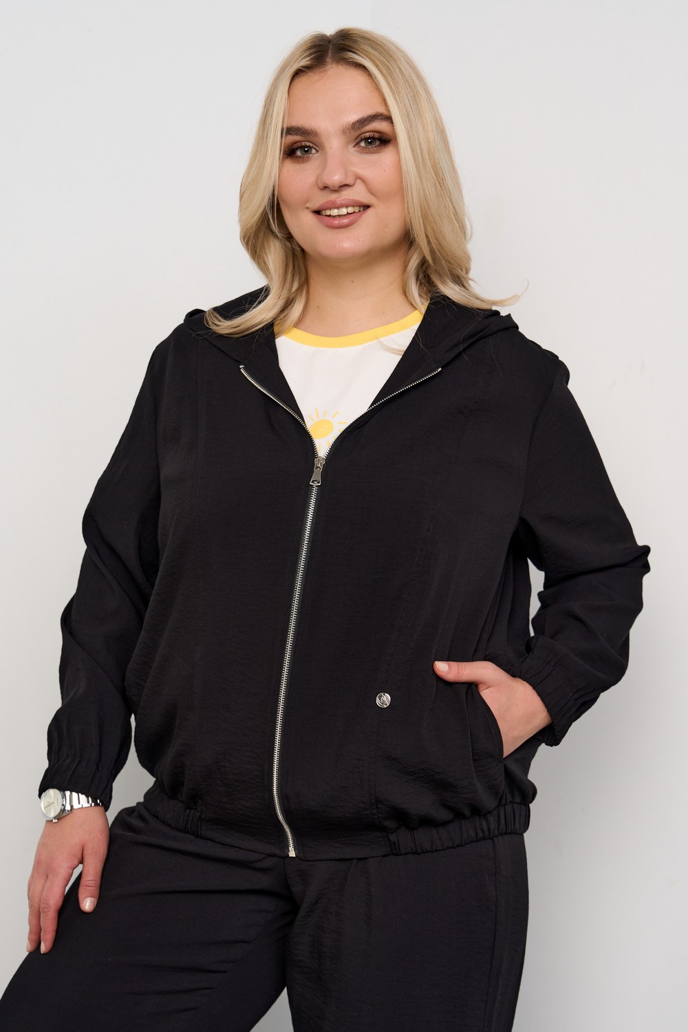 Описание: Женский черный жакет-бомбер большого размера из качественной поливискозы от бренда Интикома (Intikoma). Детали: спущенное плечо, длинный рукав на резинке по низу. Капюшон, центральная застежка на молнию, по низу изделия частично резинка, карманы по переду в рельефе. Бомбер без подкладки. Стильный комплект можно составить с брюками 724017