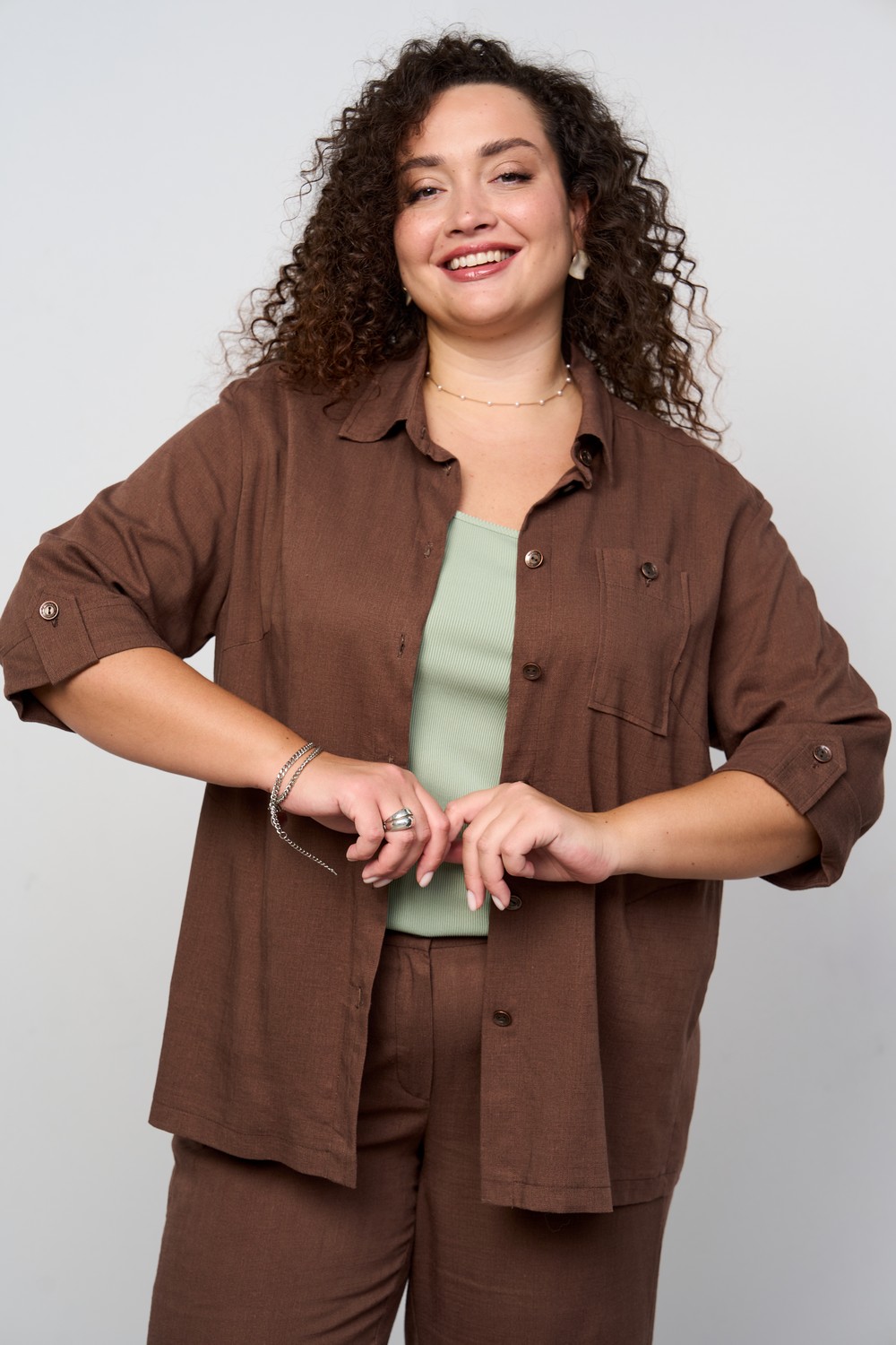 Женская коричневая блузка свободного кроя из льна от бренда Интикома (Intikoma). Стильный комплект можно составить с шортами 724028. Блузка свободного силуэта с рельефами по переду и спинке, что визуально вытягивают силуэт. Длину рукава можно регулировать с помощью паты на пуговице. Застежка центральная на пуговицах, декоративная деталь - функциональный нагрудный карман. Блузка выполнена из легкого, дышащего и приятного к телу льна. Модель подойдет на любое мероприятие.