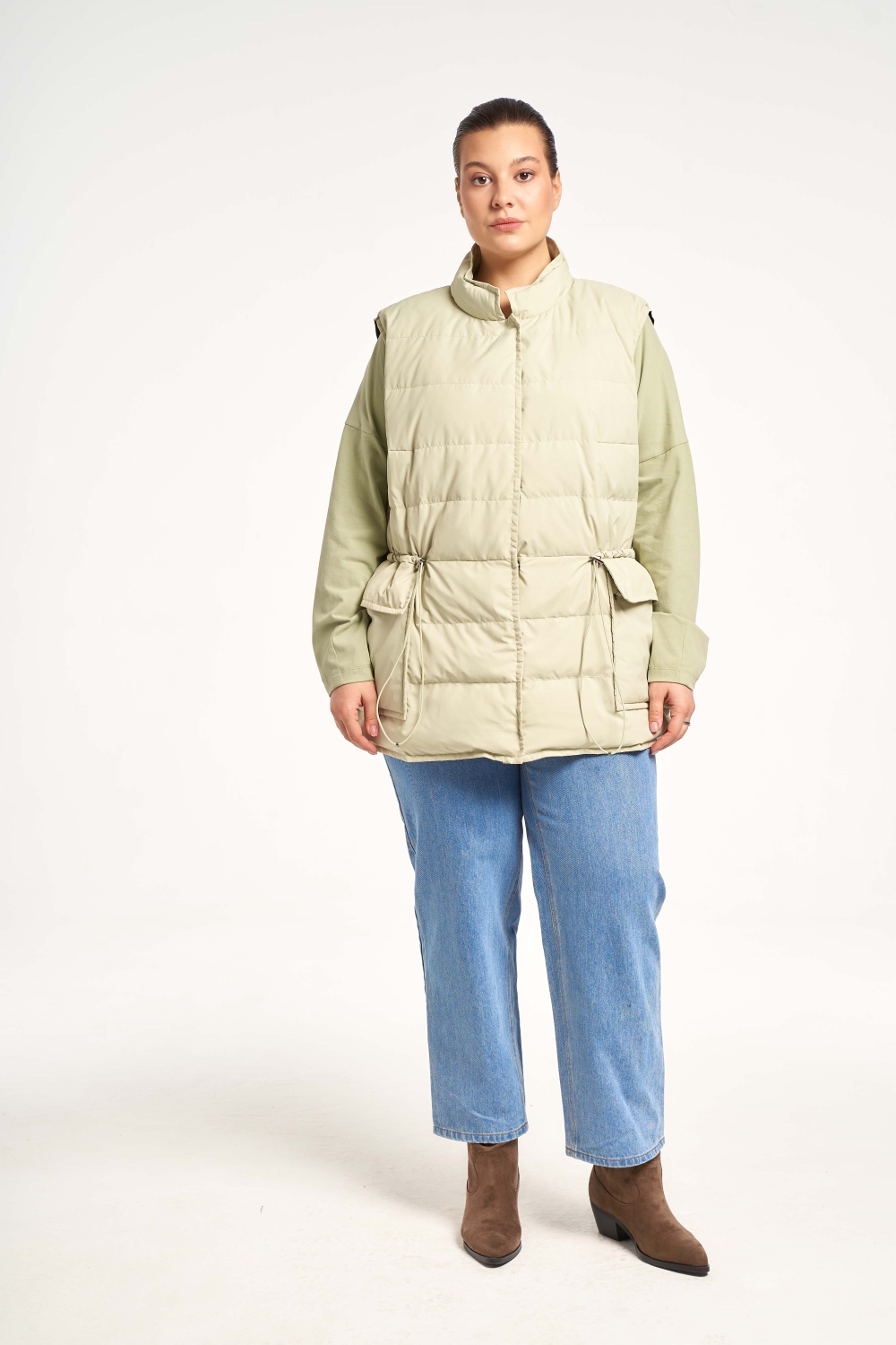 Женский оливковый демисезонный жилет большого размера от бренда Модресс (Modress). Легкий жилет прямого кроя с кулиской на талии. Воротник-невысокая стойка. Карманы накладные с клапанами. Застегивается жилет на потайные кнопки.