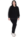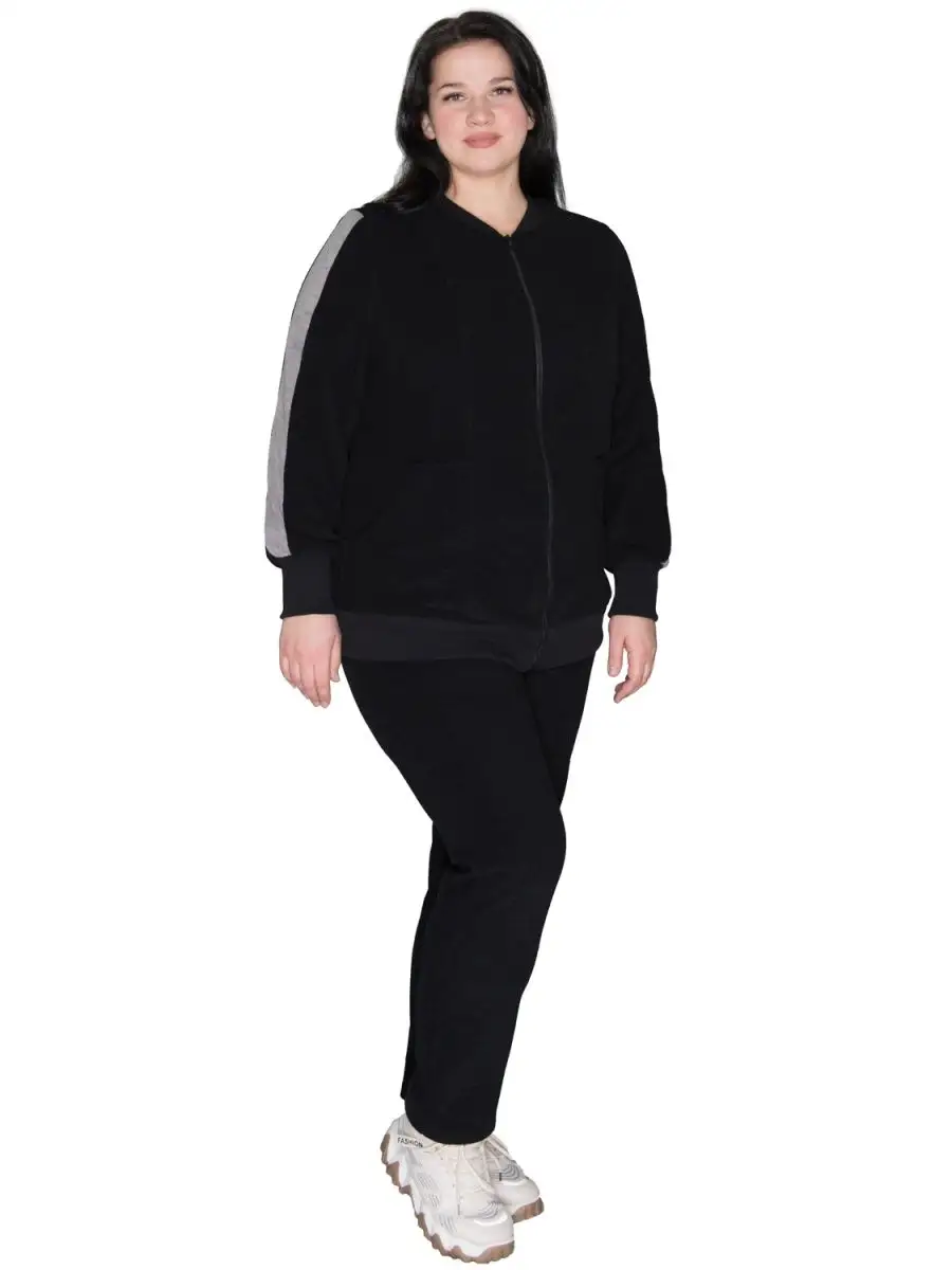 Описание: Женский черный спортивный костюм большого размера: свитшот и брюки. Костюм выполнен из плотного трикотажного х/б махрового полотна. Свитшот на молнии. Рукав рассчитан на руки большой полноты, отделан манжетой. Куртка удлиненная, слегка расширена по линии бедер, прикрывает попу.