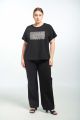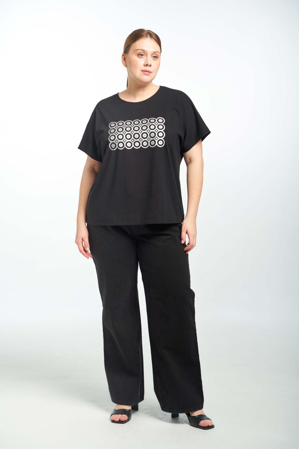 Женская черная футболка большого размера свободного кроя со спущенными рукавами из хлопка от бренда Модресс (Modress). Футболка из хлопкового трикотажа Вырез горловины круглый, длина изделия немного ниже линии бедер. Принт термопленка.