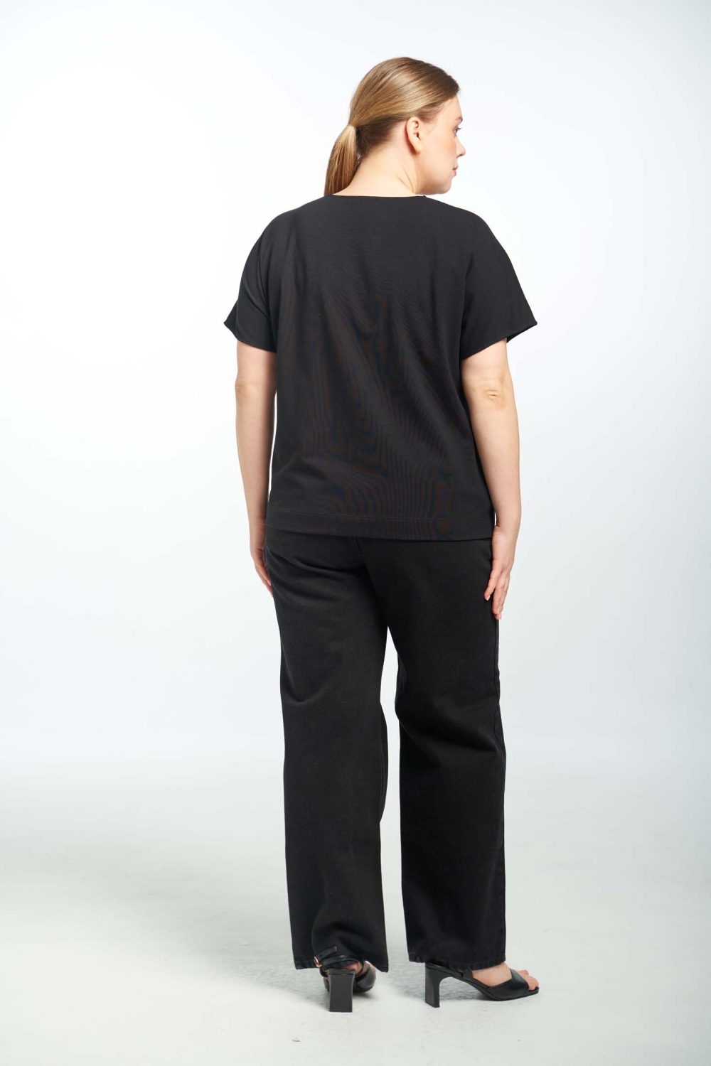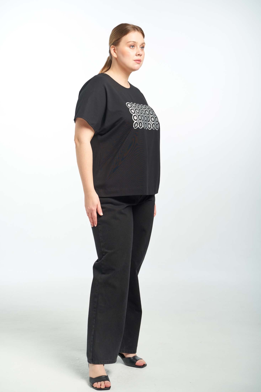 Описание: Женская черная футболка большого размера свободного кроя со спущенными рукавами из хлопка от бренда Модресс (Modress). Футболка из хлопкового трикотажа Вырез горловины круглый, длина изделия немного ниже линии бедер. Принт термопленка.