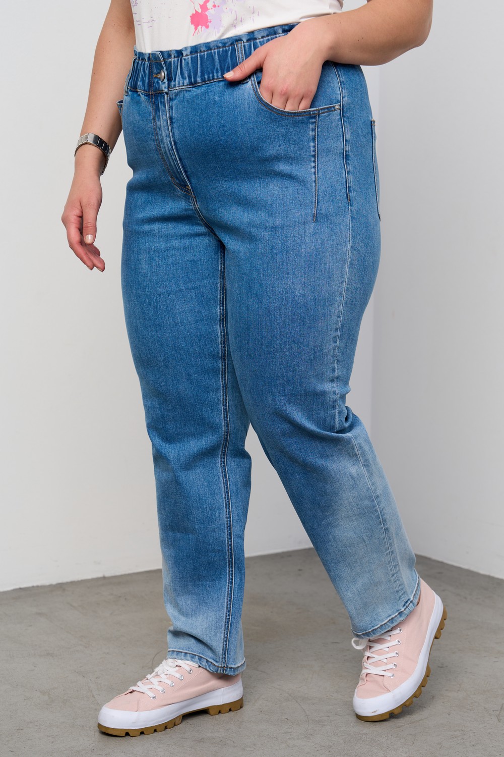 Описание: Женские голубые джинсы большого размера с градиентом от бренда Интикома (Intikoma). Джинсы с плавным градиентом из белого в светло-голубой оттенок. Детали: функциональные карманы по переду, застежка - пуговица на поясе и гульфик на молнии, пояс на резинке, накладные карманы на спинке.