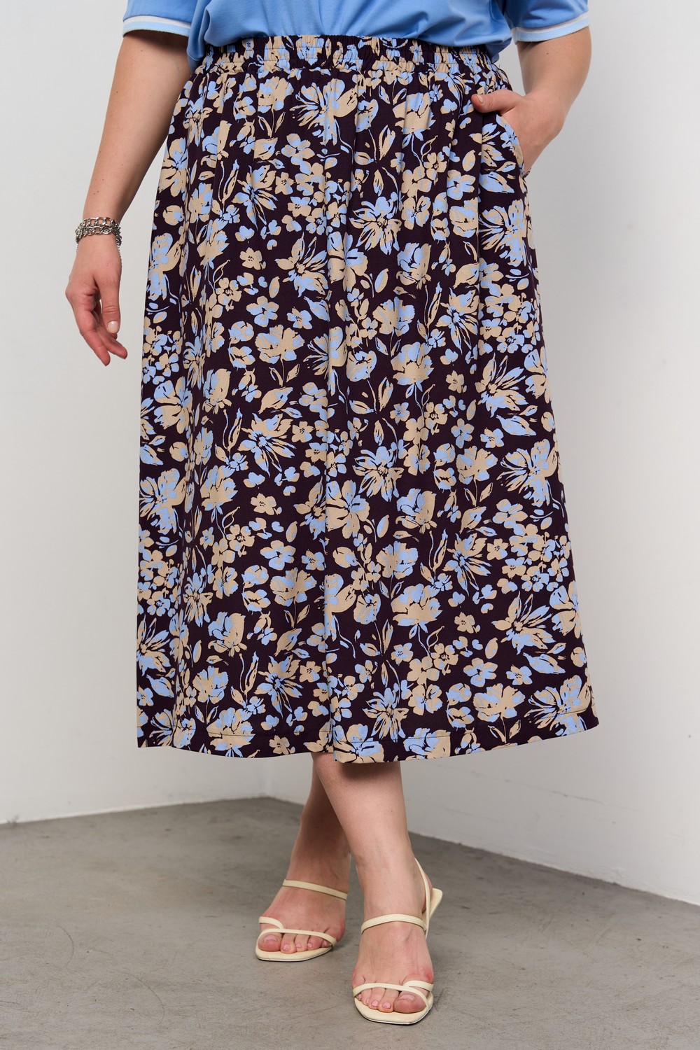 Женская юбка миди с цветочным принтом большого размера из вискозы от бренда Интикома (Intikoma). Детали: комфортная посадка на талии, пояс сделан на резинке, карманы по переду.