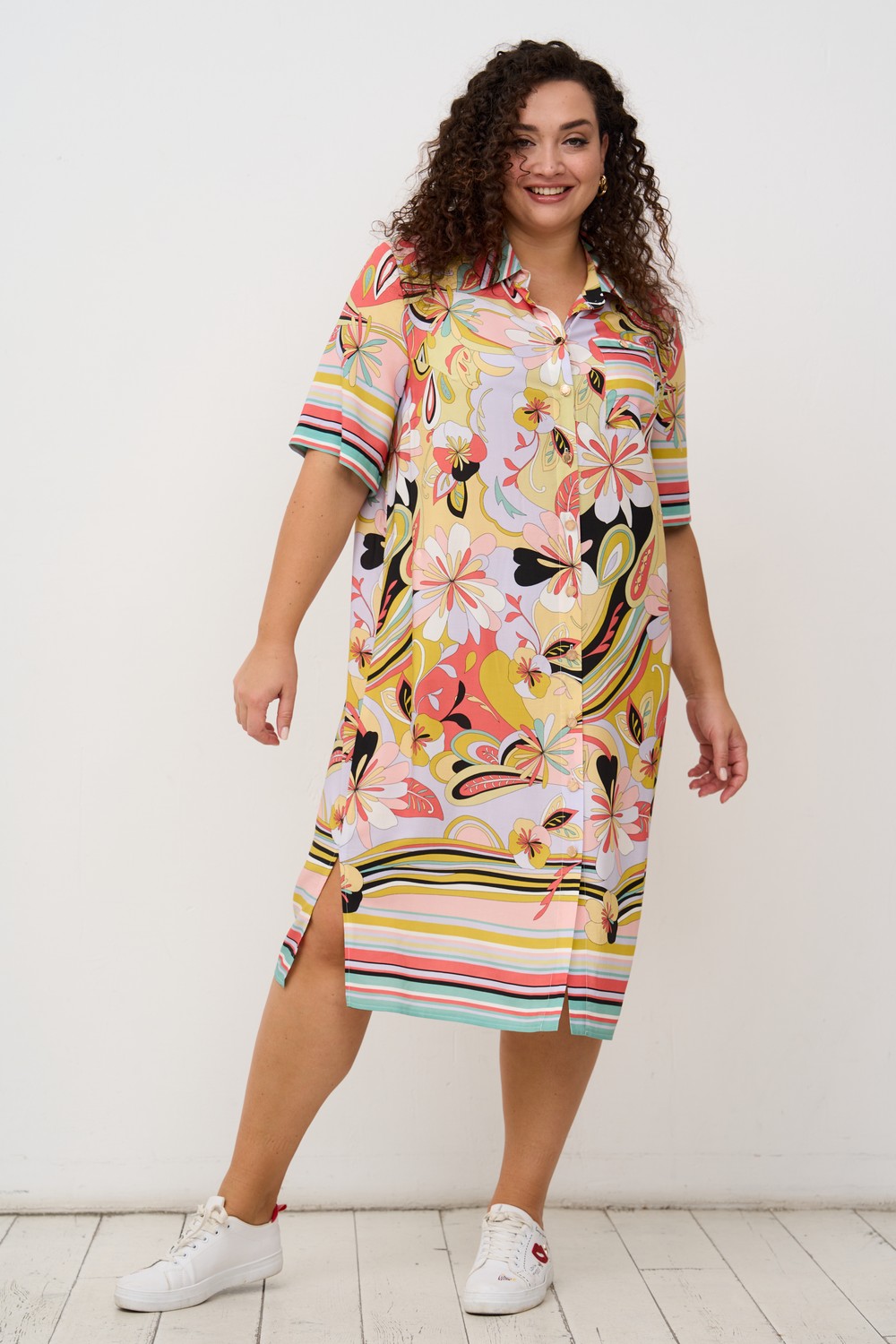 Женское летнее платье-рубашка большого размера с абстрактным принтом из вискозы от бренда Интикома (Intikoma). Детали: прямой силуэт, разрезы по бокам обеспечат свободу движения, центральная застежка планка по всей длине по переду на пуговицы. Воротник отлажная стойка, короткий рукав, карманы в боковом шве.