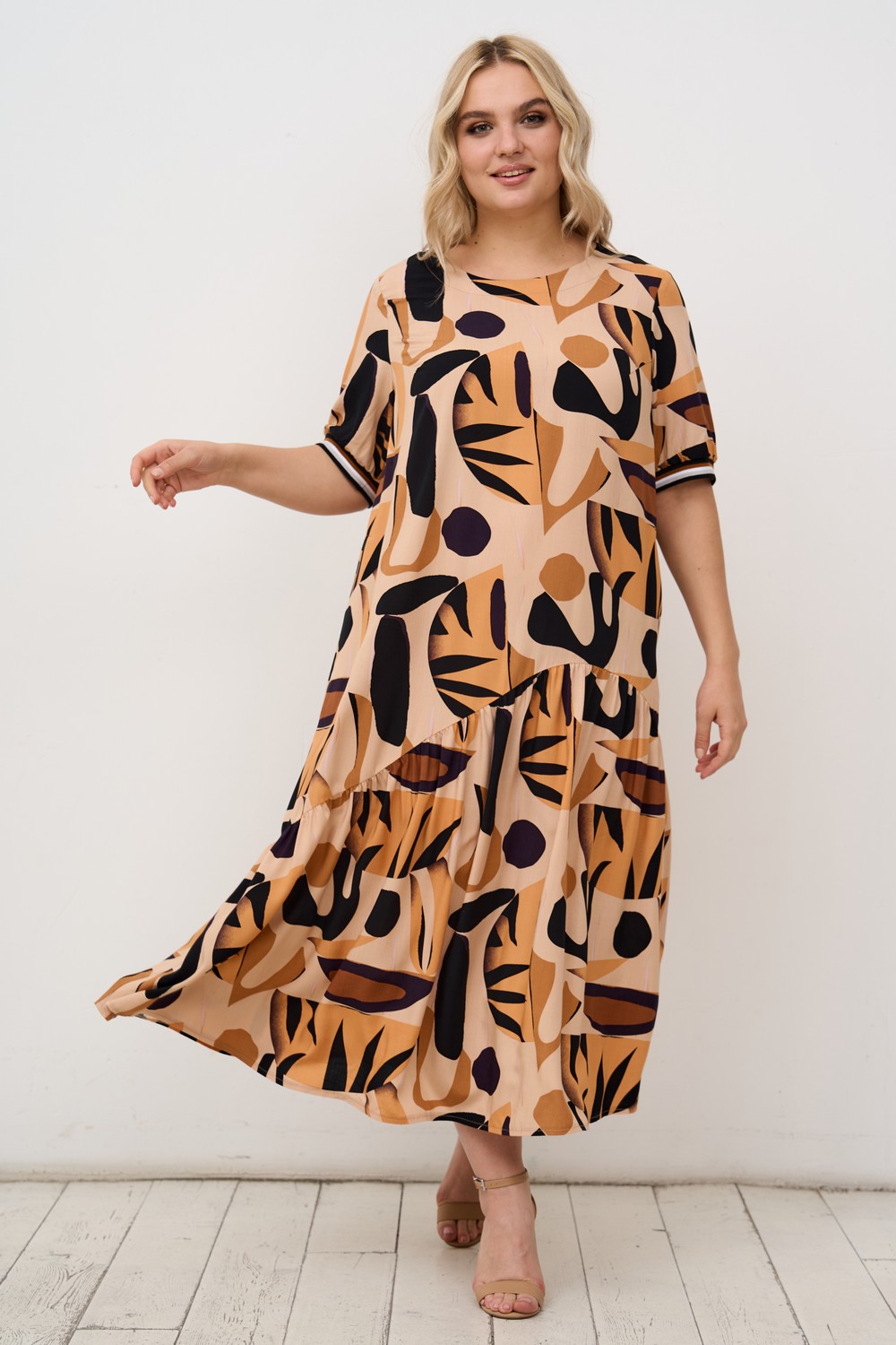 Женское летнее бежево-черное макси платье большого размера из вискозы от бренда Интикома (Intikoma). Выполнено из высококачественной вискозы. Комфортное в носке, воздушное и невесомое. Волан по низу платья делает вашу походку легкой и женственной. Модель хорошо подойдет на любые мероприятия меняя аксессуары. Детали: длина миди, свободный силуэт, подрез по платью в виде волны, рукав короткий на эластичной манжете, округлая горловина, карманы в шве.