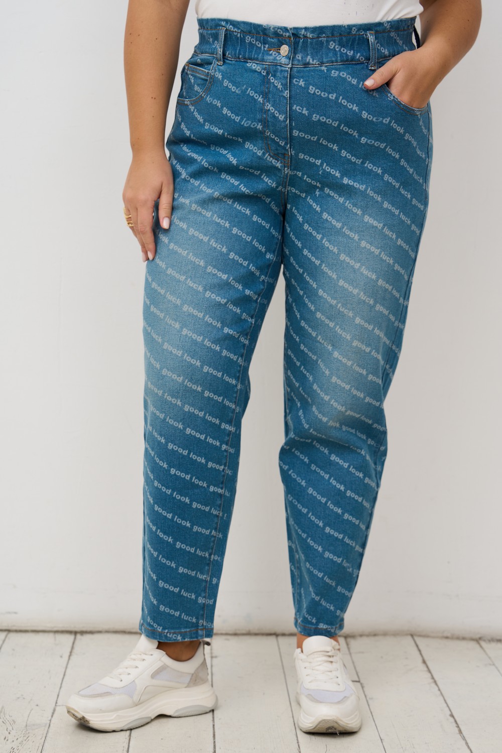 Женские голубые джинсы большого размера с надписями от бренда Интикома (Intikoma). Модель выполнена из хлопка с добавлением эластана и очень приятен к телу.Пояс эластичный, на резинке, имеются шлевки для ношения с ремнем. Все карманы функциональные. Детали: карманы по переду, на спинке накладные карманы, пояс на резинке, застежка на пуговицу и гульфик с молнией.