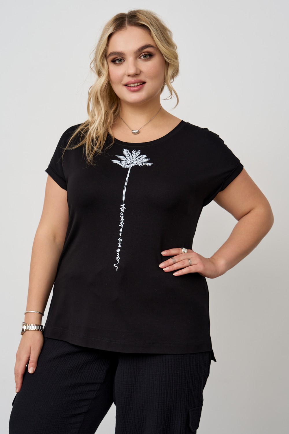 Описание: Женская черная с принтом футболка большого размера из вискозы от бренда Интикома (Intikoma). Модель со спущенной линией плеча без рукава с узкой манжетой. Выполнена из приятного к телу плотного хлопкового трикотажа с добавлением эластана, чтобы изделие лучше сохраняло форму, дольше служило и за ним было проще ухаживать.