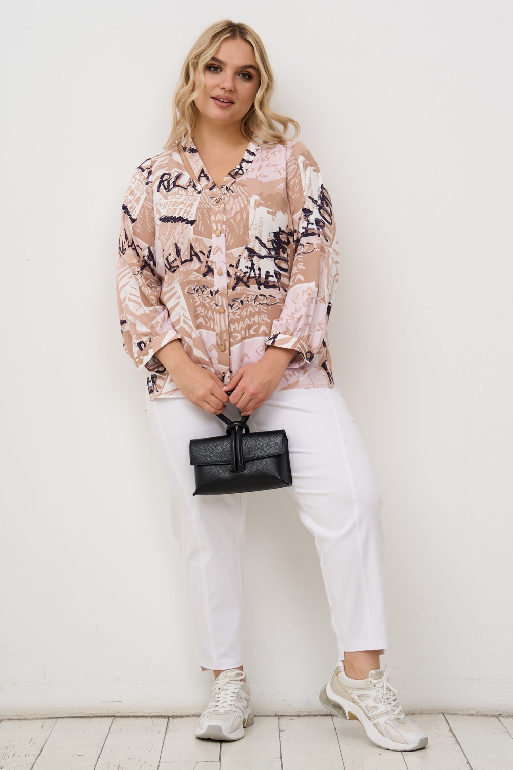 Описание: Женская бежевая с принтом блузка большого размера из вискозы свободного кроя от бренда Интикома (Intikoma). Детали: прямой силуэт, центральная застежка на пуговицах, линия плеча на месте, пикантность рубашке придает ненавязчивый разрез, широкий рукав на манжете. Разрезы по боковым швам.